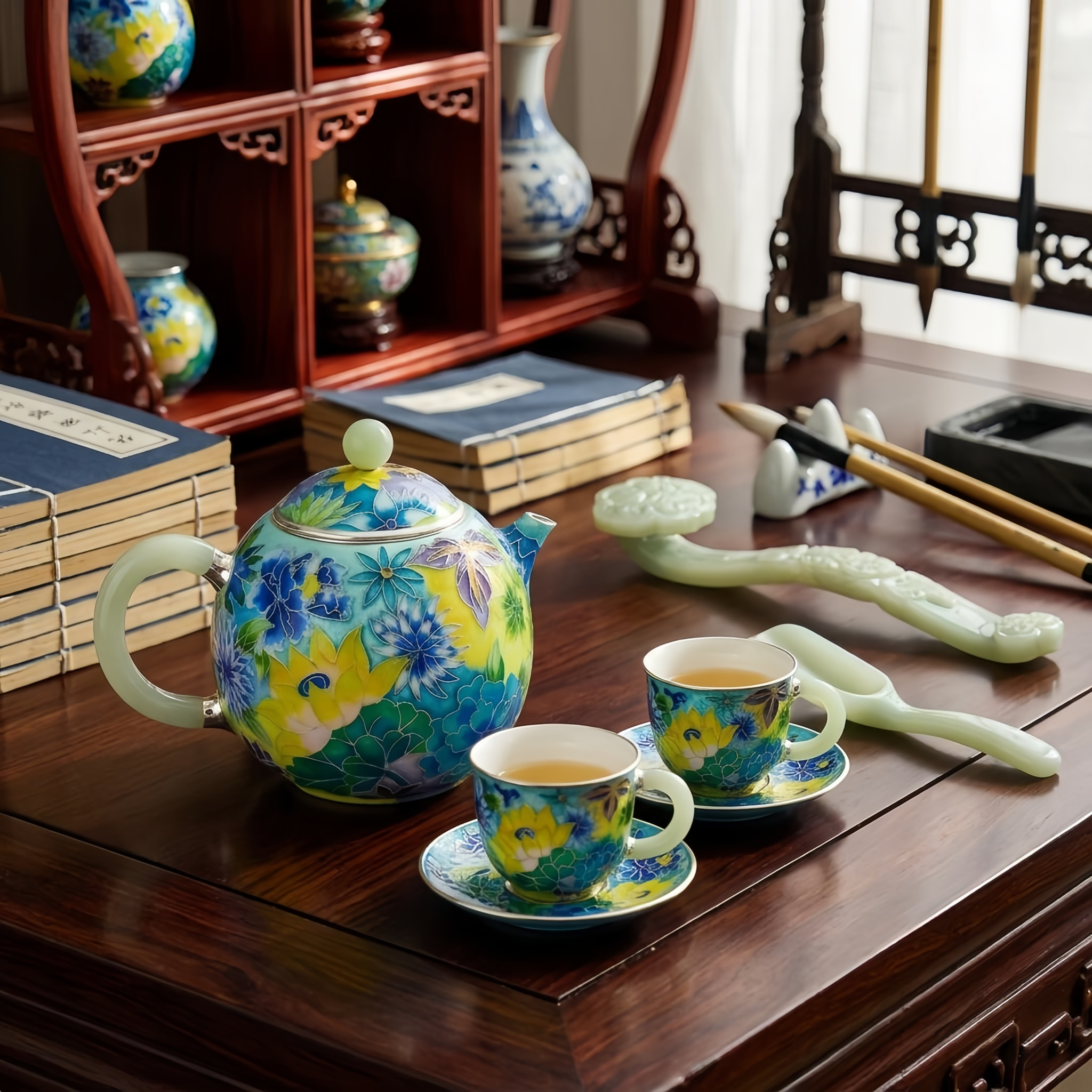 925 Sterling Silver Handcrafted Floral Cloisonné Enamel Teapot with Translucent Jade-Colored Handle and Knob - Handicraft