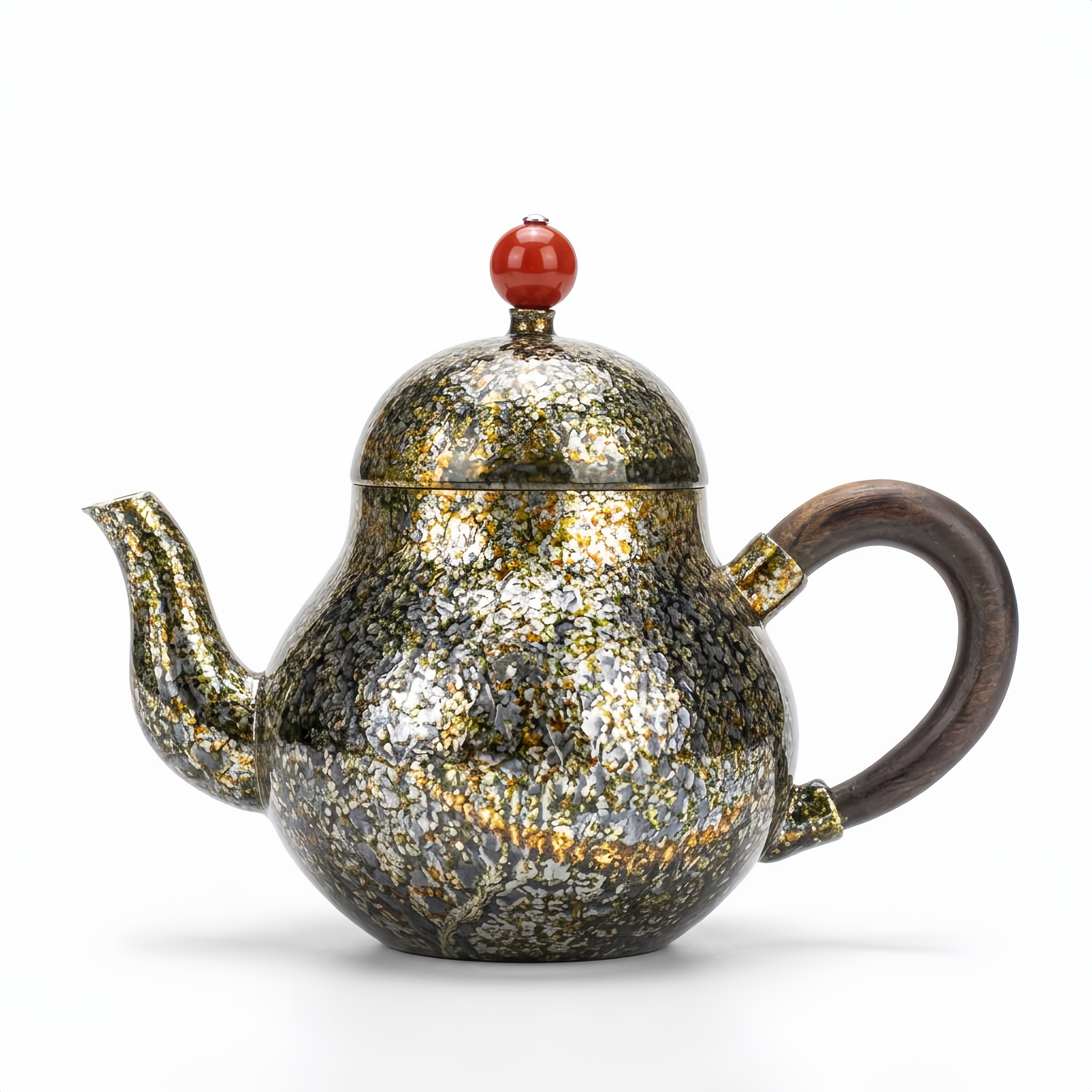 925 Sterling Silver Artistic Mottled Metal Teapot with Red Finial and Polished Dark Wood Handle - Handicraft