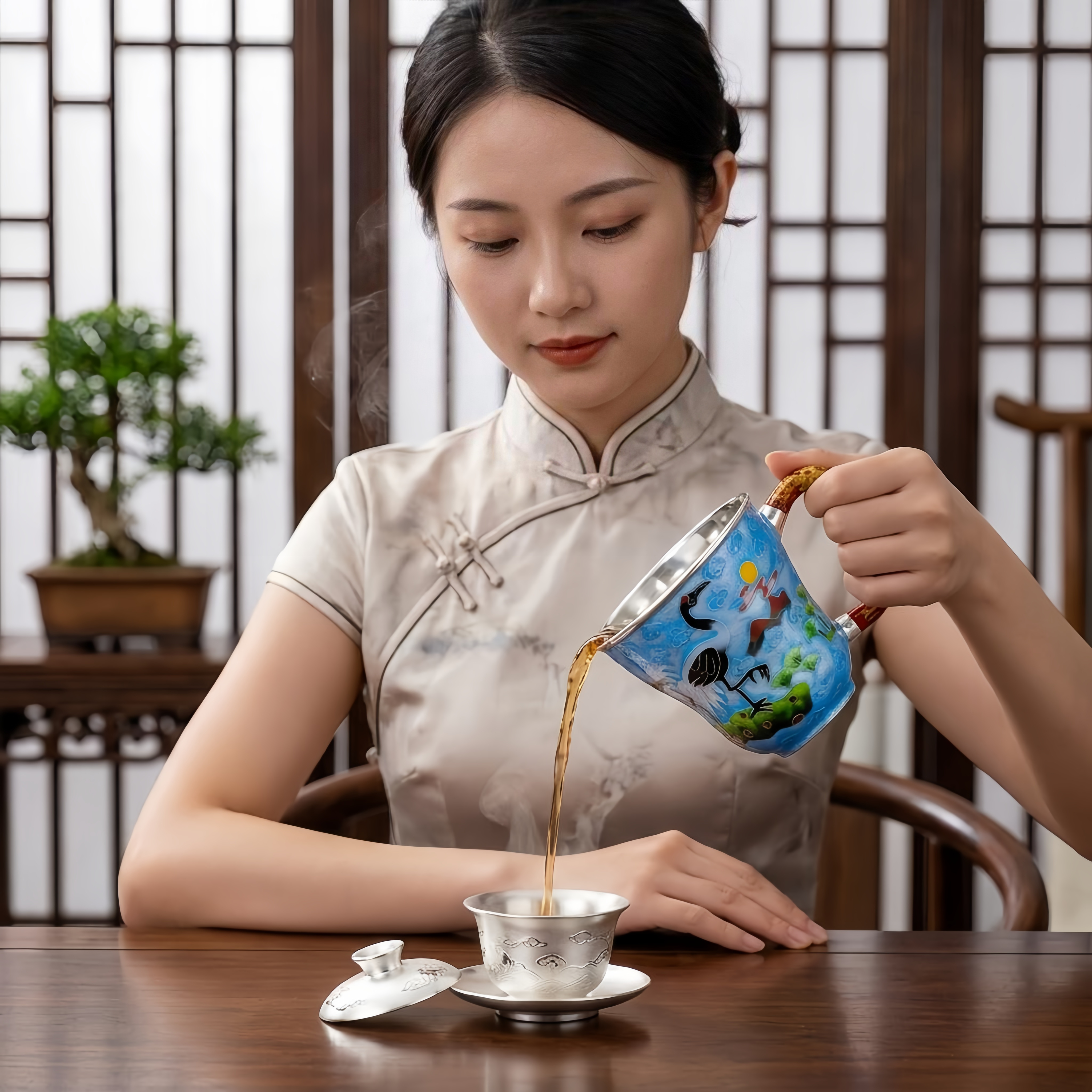 925 Sterling Silver Elegant Handcrafted Enamel Crane Mug with Ornate Crimson Handle and Silver Interior - Handicraft