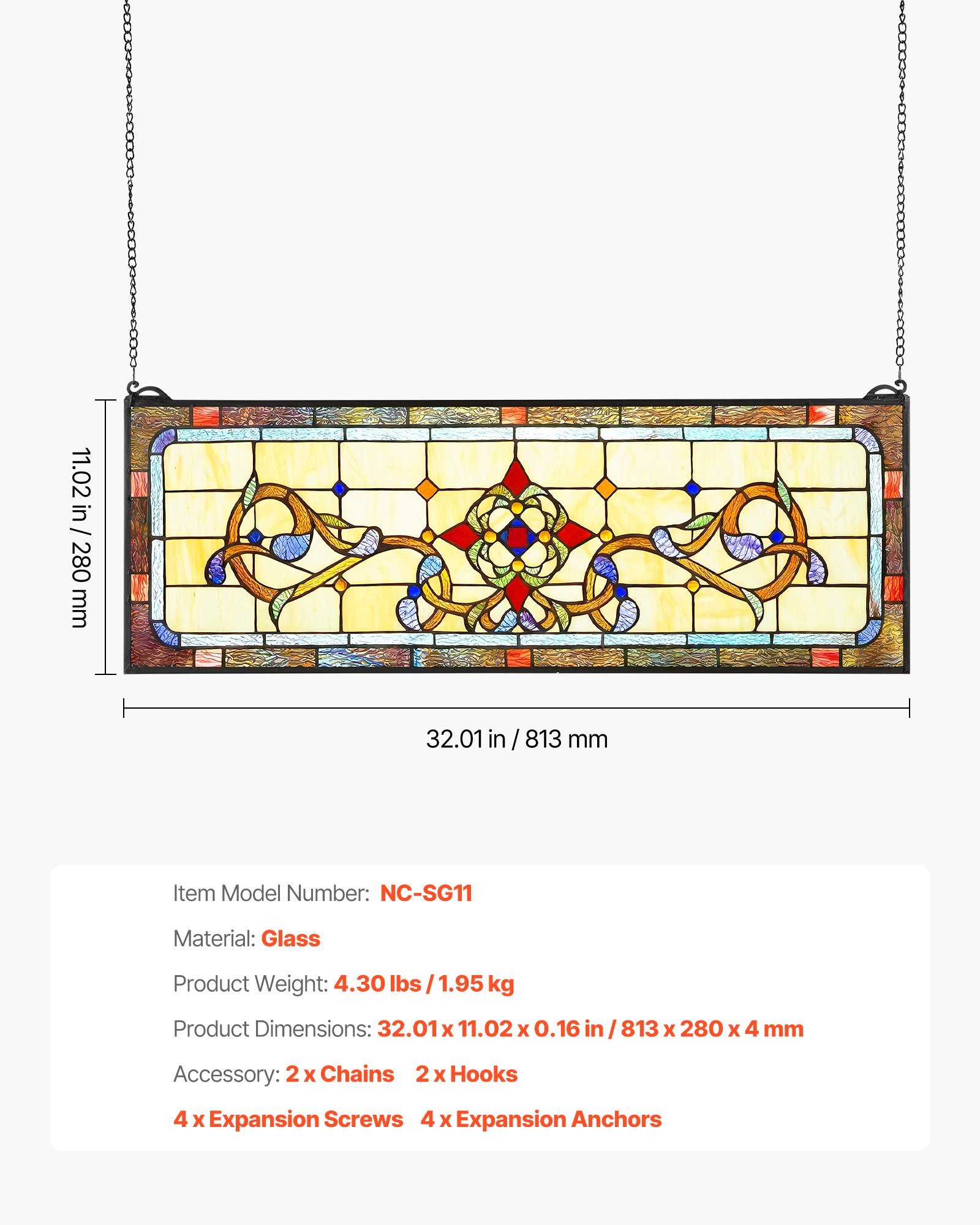 Stained Glass Window Panel, 32" X 11" Tiffany Style Hanging Transom Window Panel With Chain, Large Horizontal Rectangle Stain Glass, Vintage Traditional Art Handcrafts For Kitchen Home Decor