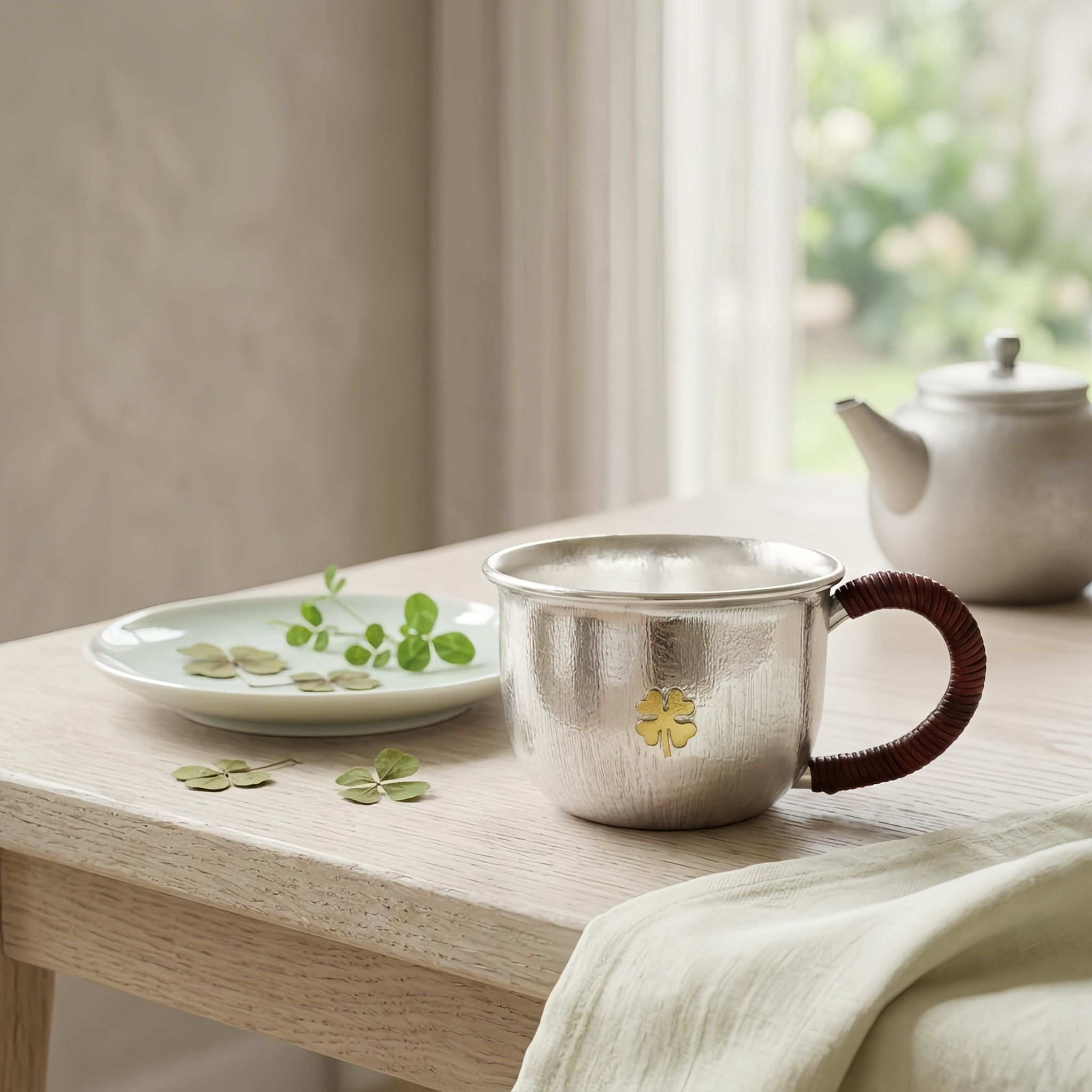 925 Sterling Silver Hammered Silver Cup with Four-Leaf Clover Motif and Rattan Wrapped Handle - Handicraft
