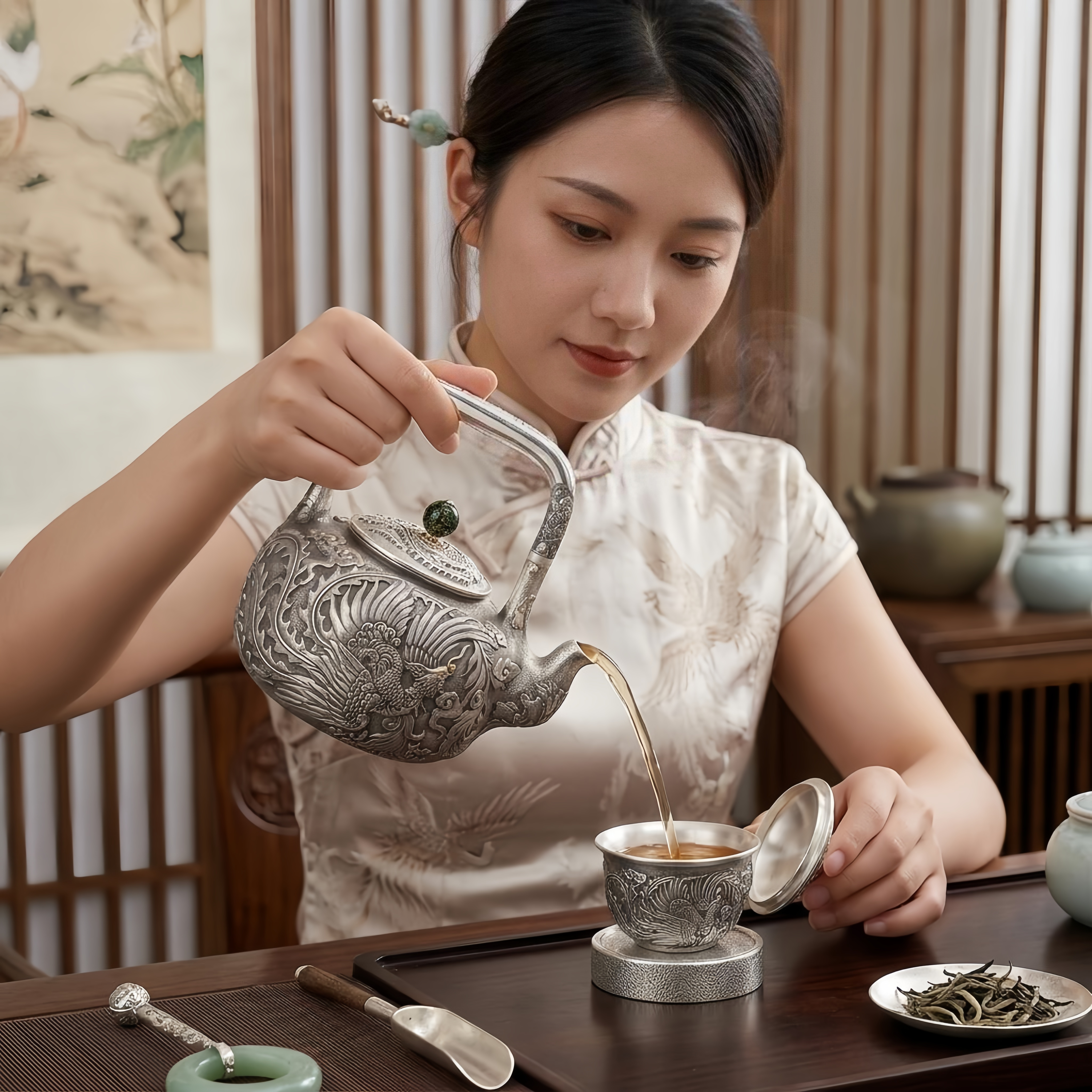 925 Sterling Silver Antique Teapot with Intricate Phoenix and Cloud Motifs: Handcrafted Elegance-Fine large teapot - Handicraft