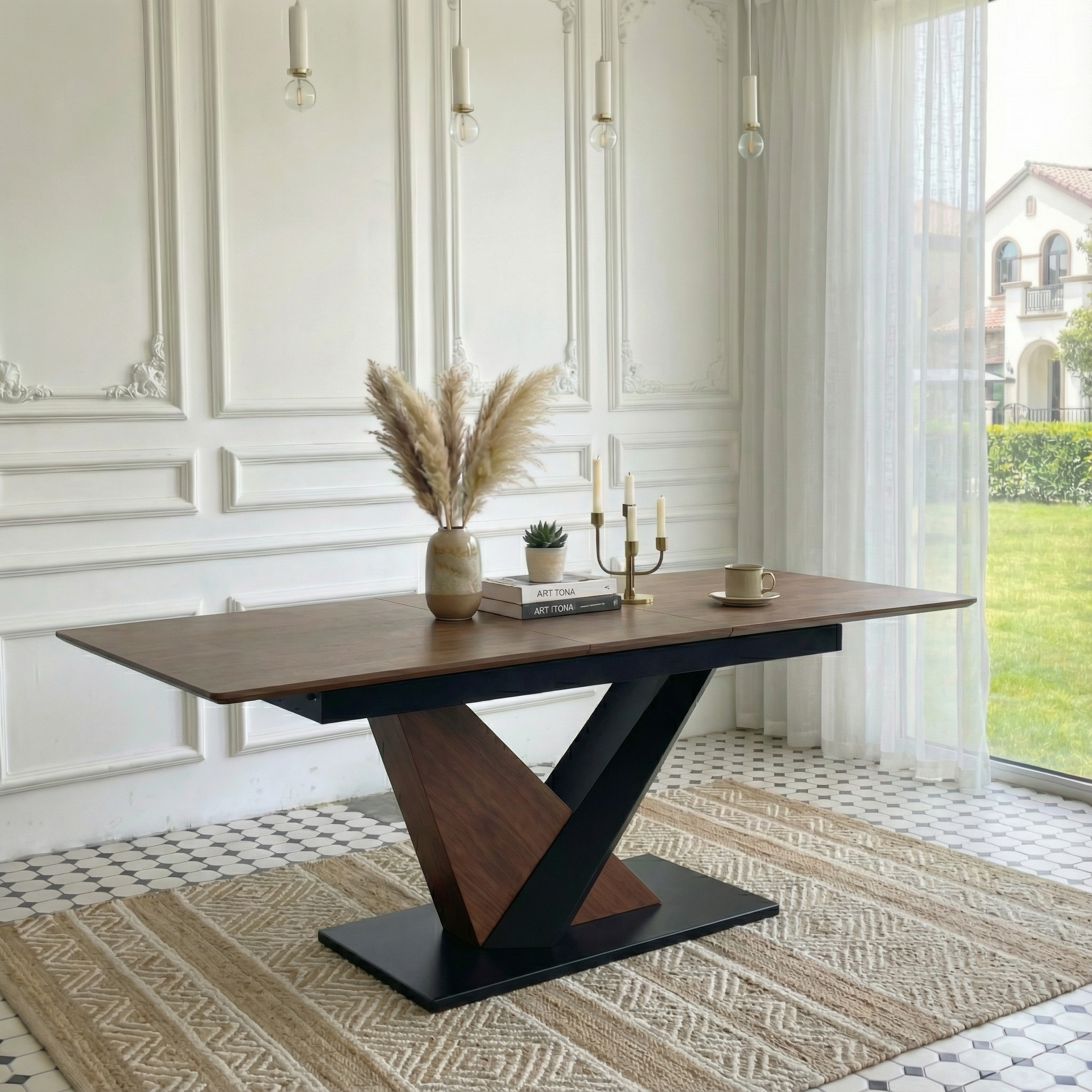 Modern Dining Table With MDF Solid Wood Veneer Tabletop, Natural Texture, Scratch-Resistant, Cross Geometric Metal Legs For Contemporary Kitchen & Dining Room Dark Walnut, 1 Table