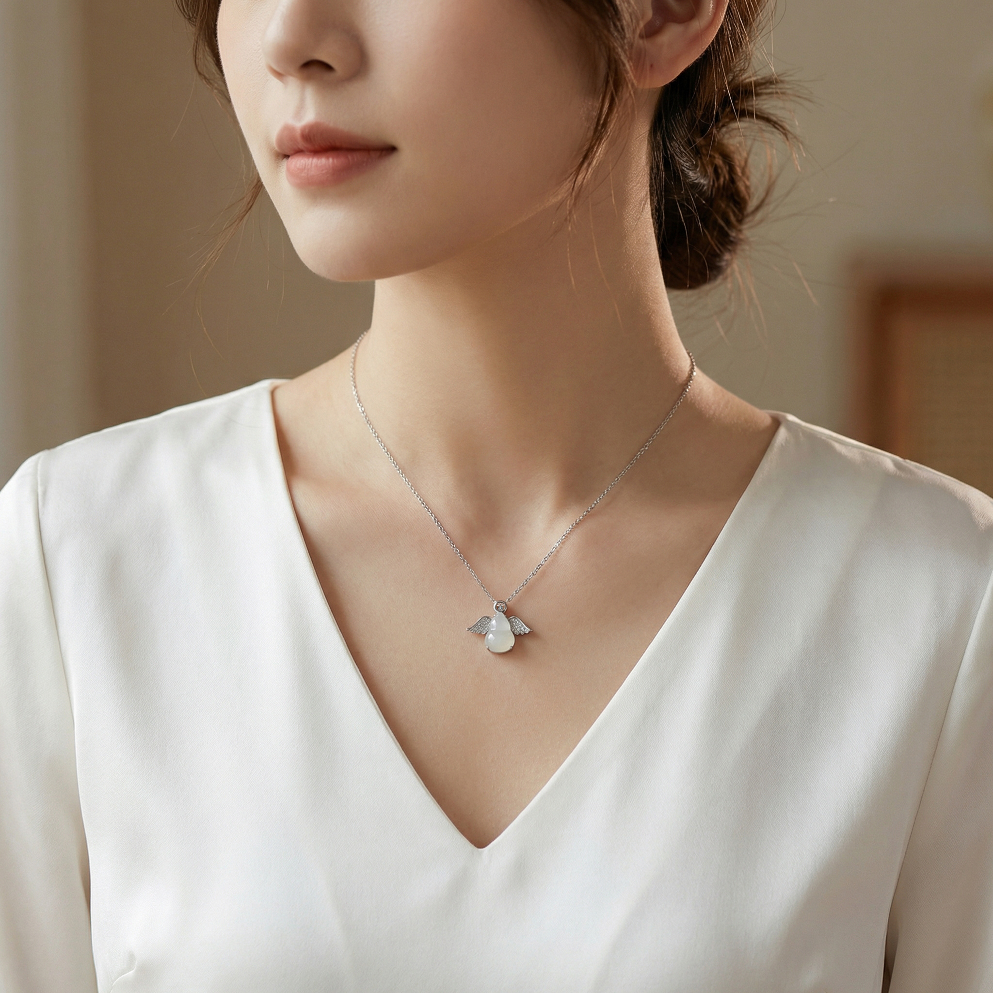 925 Sterling Silver Elegant Silver Angel Wings Gourd Pendant Necklace with White Jade and CZs