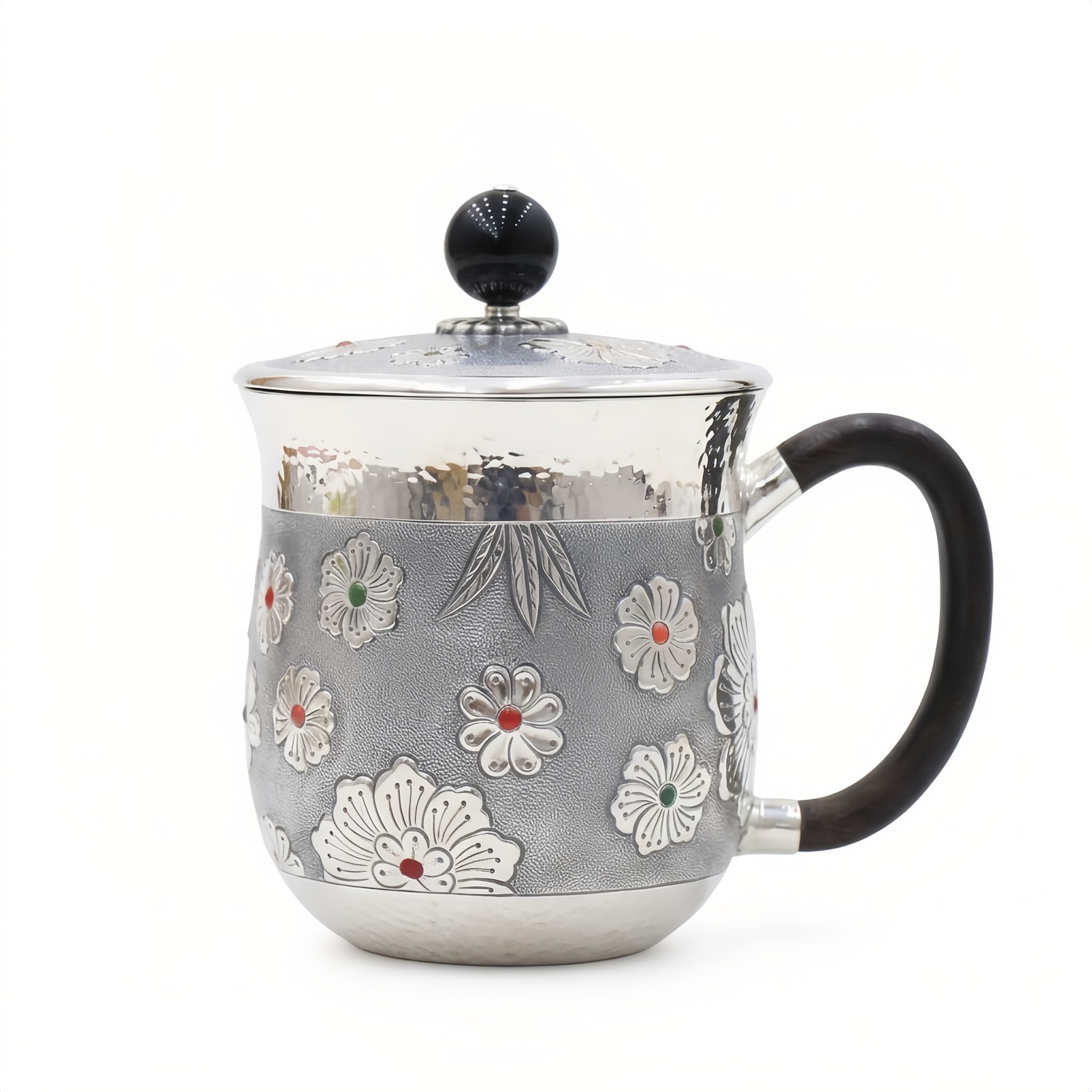 925 Sterling Silver Elegant Teapot with Floral Gemstone Accents and Wooden Handle-Premium Tea Mug - Handicraft
