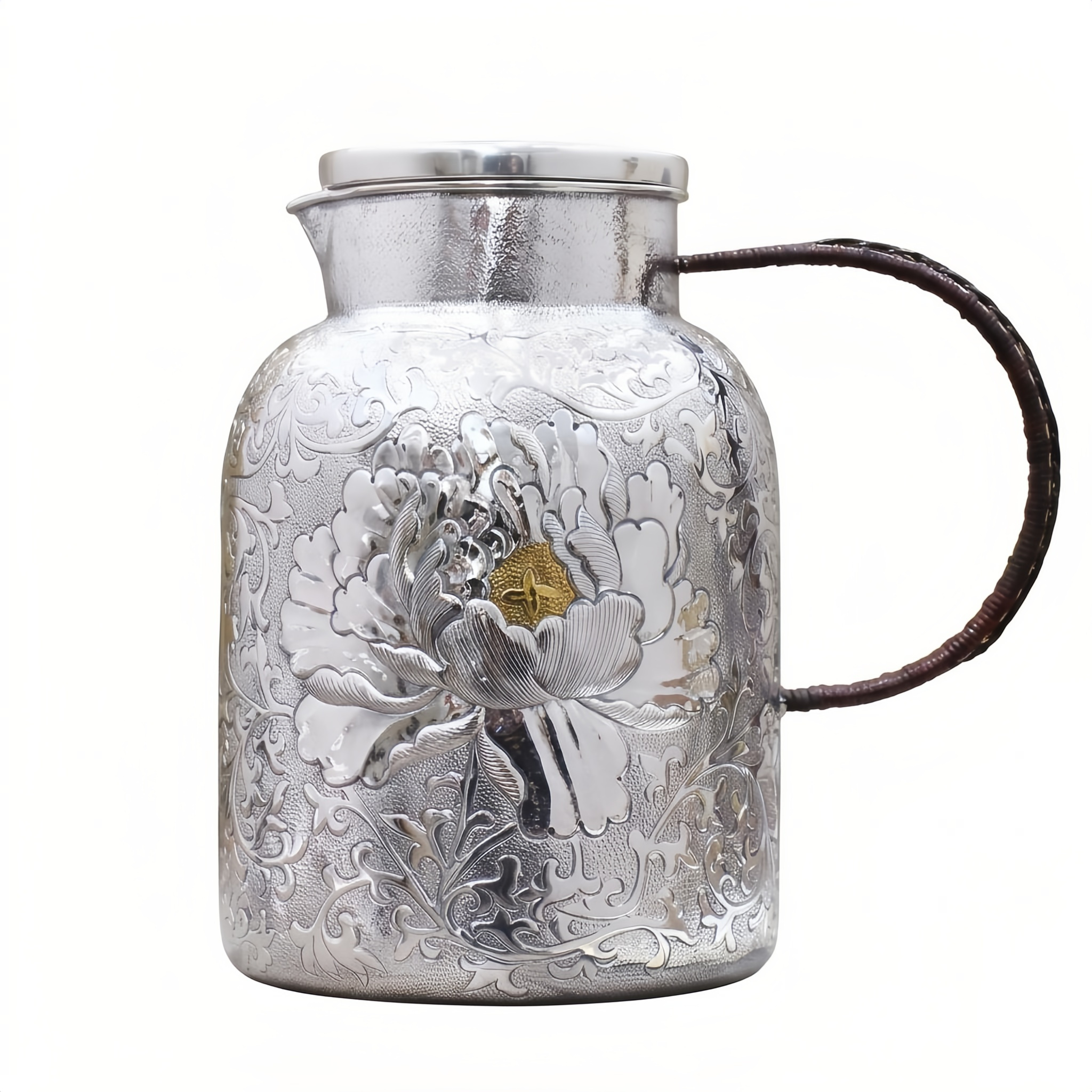 925 Sterling Silver Handcrafted Silver Pitcher Featuring Exquisite Peony Relief and Woven Handle - Handicraft