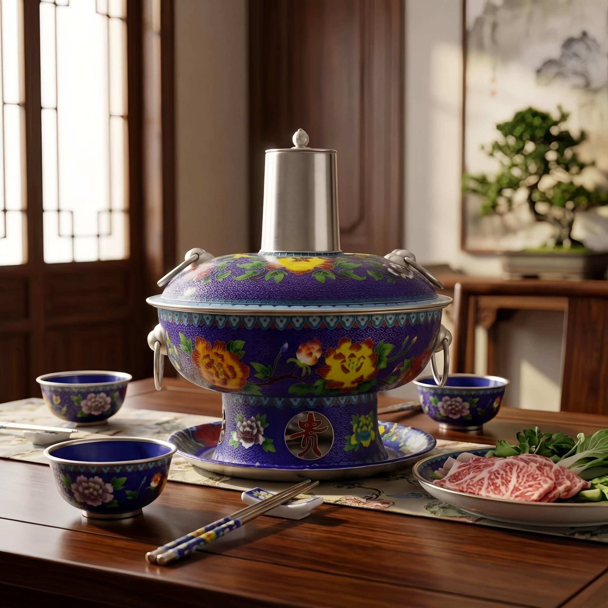 925 Sterling Silver Traditional Cloisonné Enamel Hot Pot with Purple Floral Patterns and Polished Chimney - Handicraft