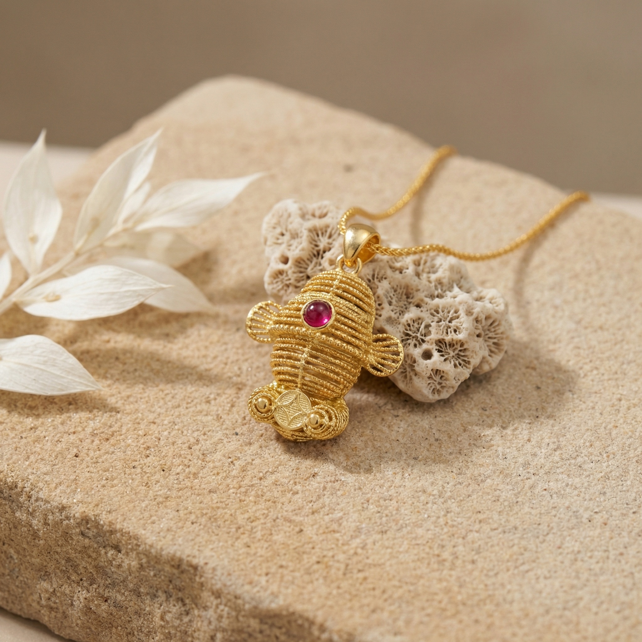925 Sterling Silver Ornate Handcrafted Filigree Fish Pendant with Vibrant Central Ruby Accent