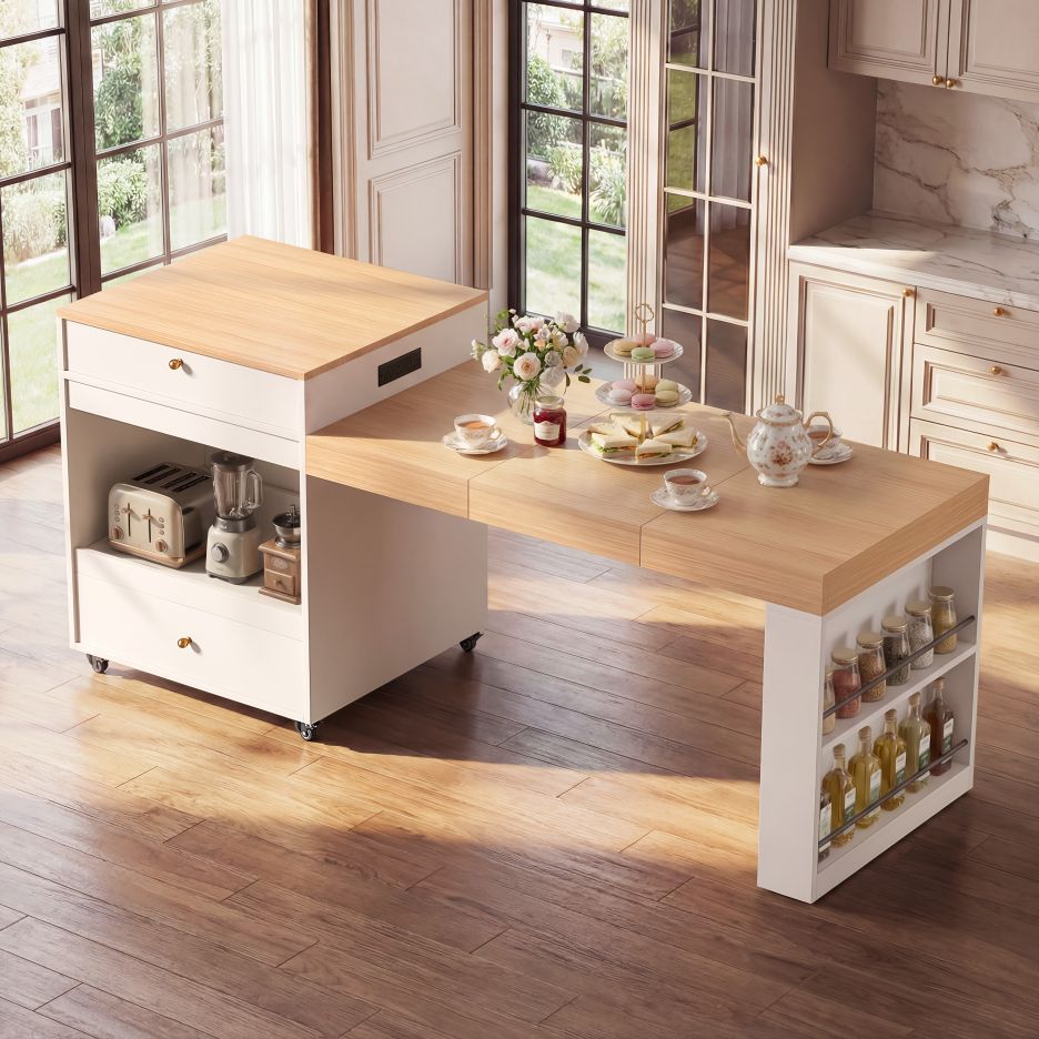 78.8inch Rolling Kitchen Island With 3-Stage Extendable Dining Table Seats 6-8, Built-in Power Outlet, Ample Storage Drawers & Cabinets, Mobile On Wheels - High-Density MDF, Easy Assembly