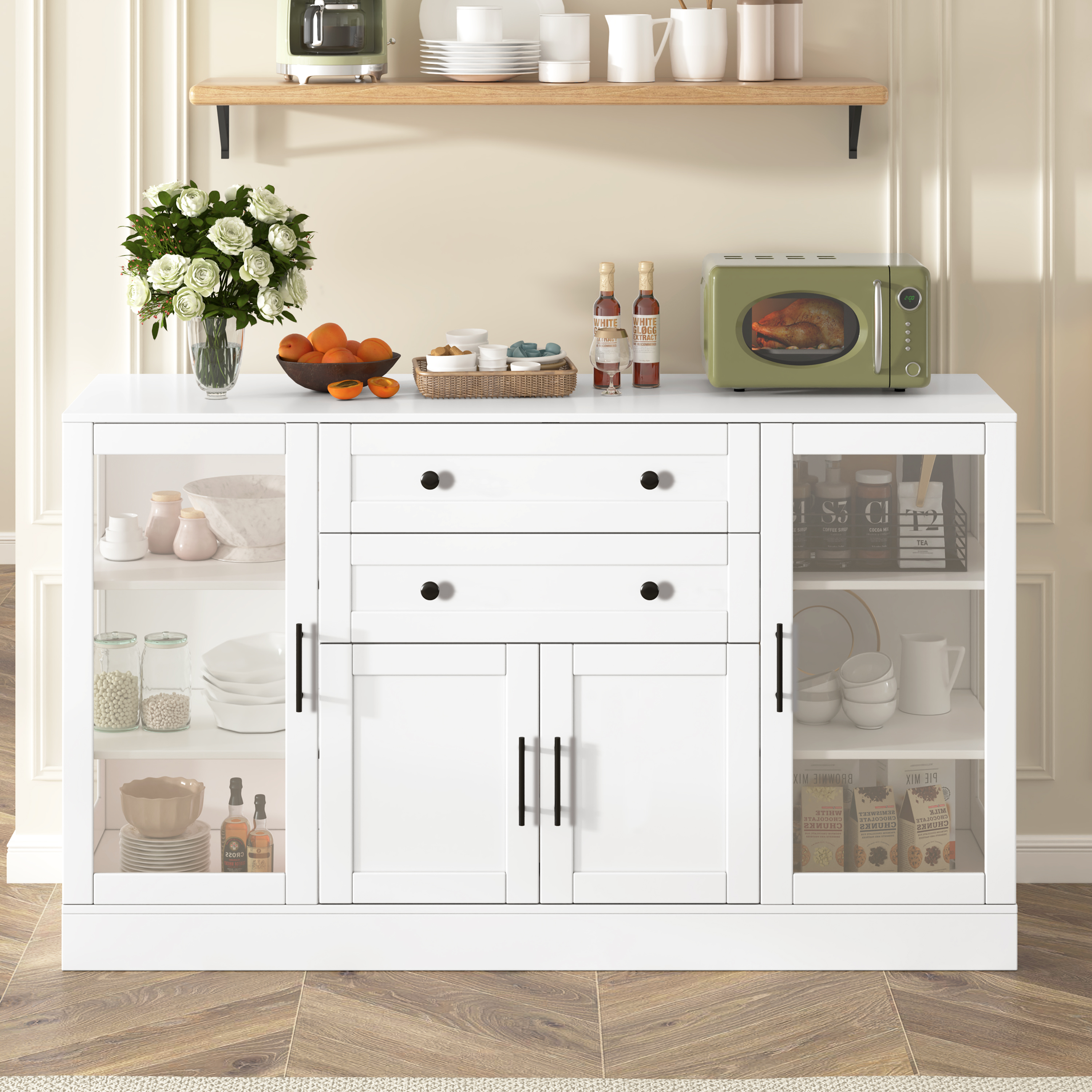 U- Style 58.3 Modern Buffet Sideboard With 4 Doors & 2 Drawers Adjustable Shelves Power Outlet Acrylic Panels Aluminum Alloy Handles Storage Cabinet For Dining Room Living Room And Kitchen