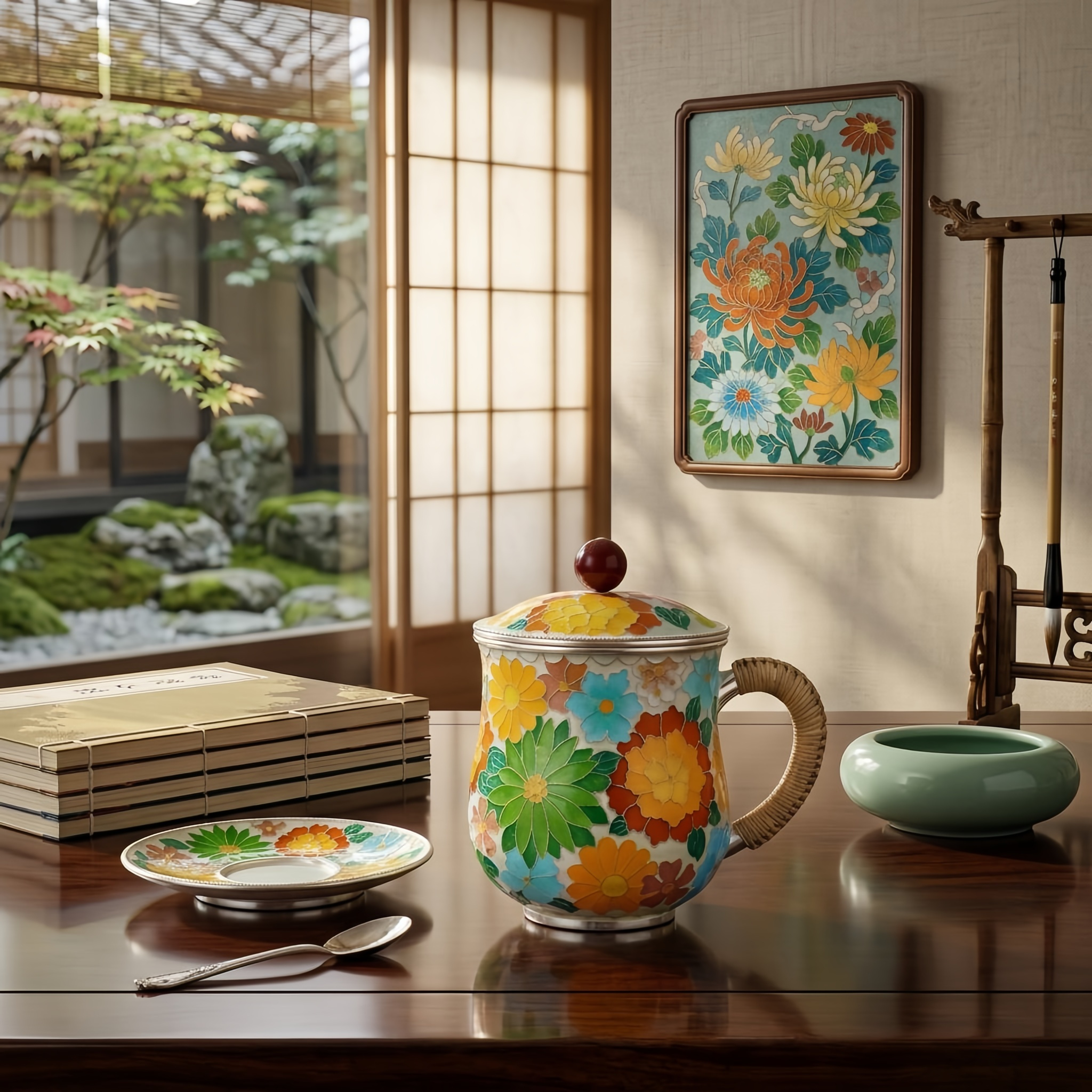 925 Sterling Silver Elegant Ceramic Floral Mug with Woven Handle and Lid-Premium Indigo Tea Mug - Handicraft