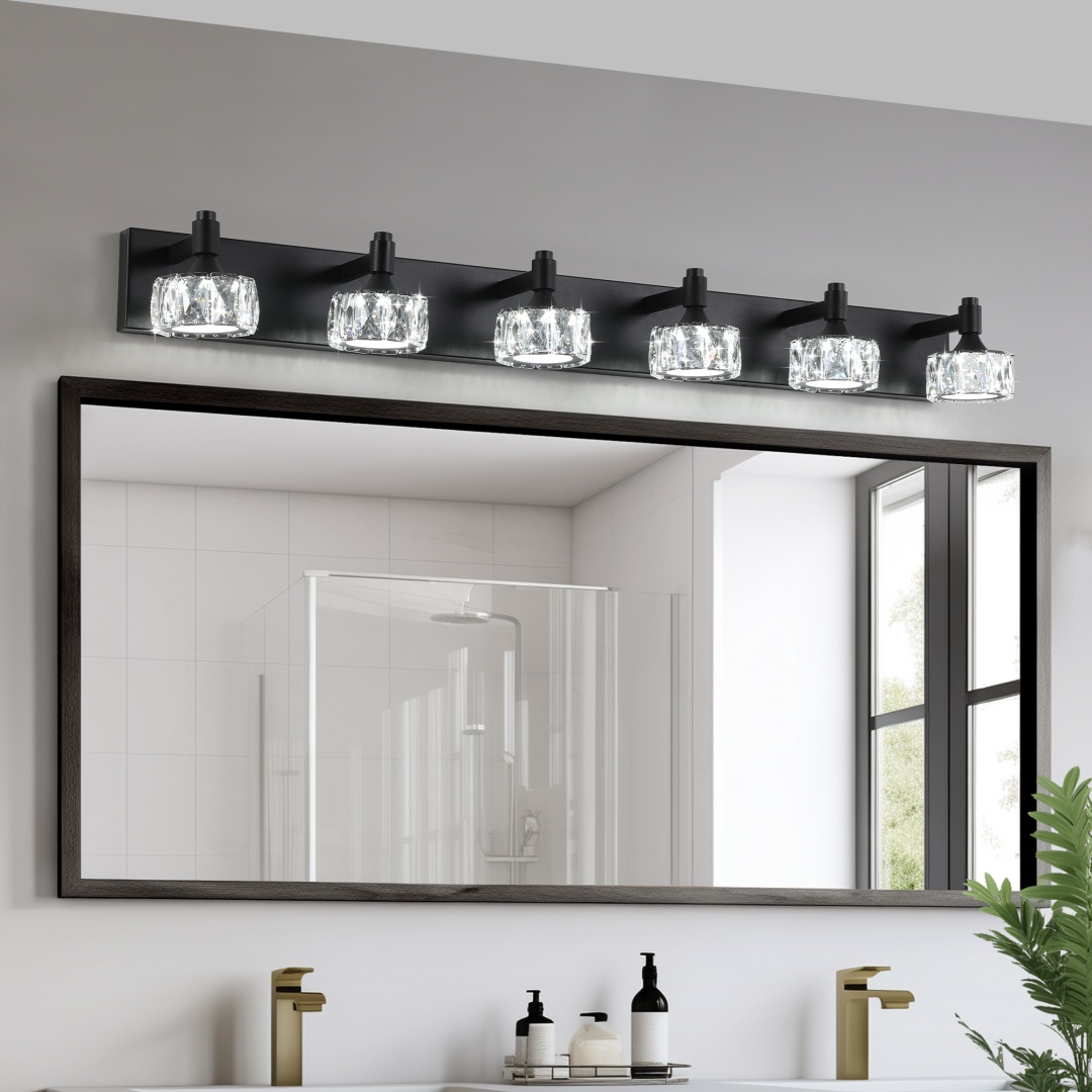 Modern 6-Light Matte Black LED Vanity Light Fixture With Crystal Glass Shades, Bathroom Wall Sconce For Elegant And Contemporary Home Decor