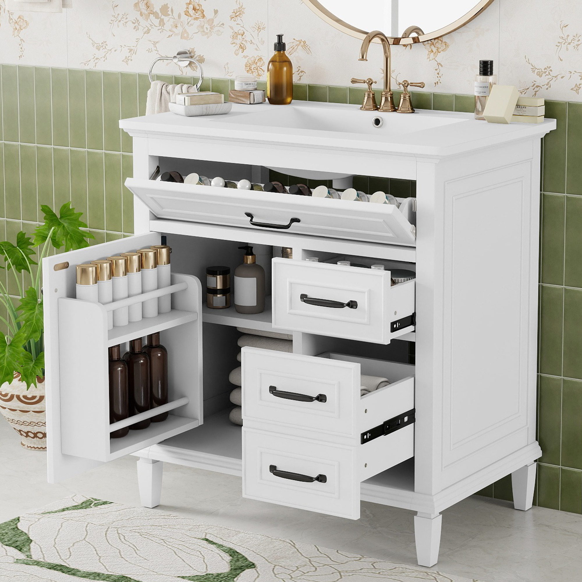 30 Inch Bathroom Vanity With Ceramic Sink Top, Solid Wood Frame, MDF & Pine Cabinet, Flip Drawers, Adjustable Shelf, And Zinc Alloy Handles, Freestanding Storage Cabinet Faucet Not Included