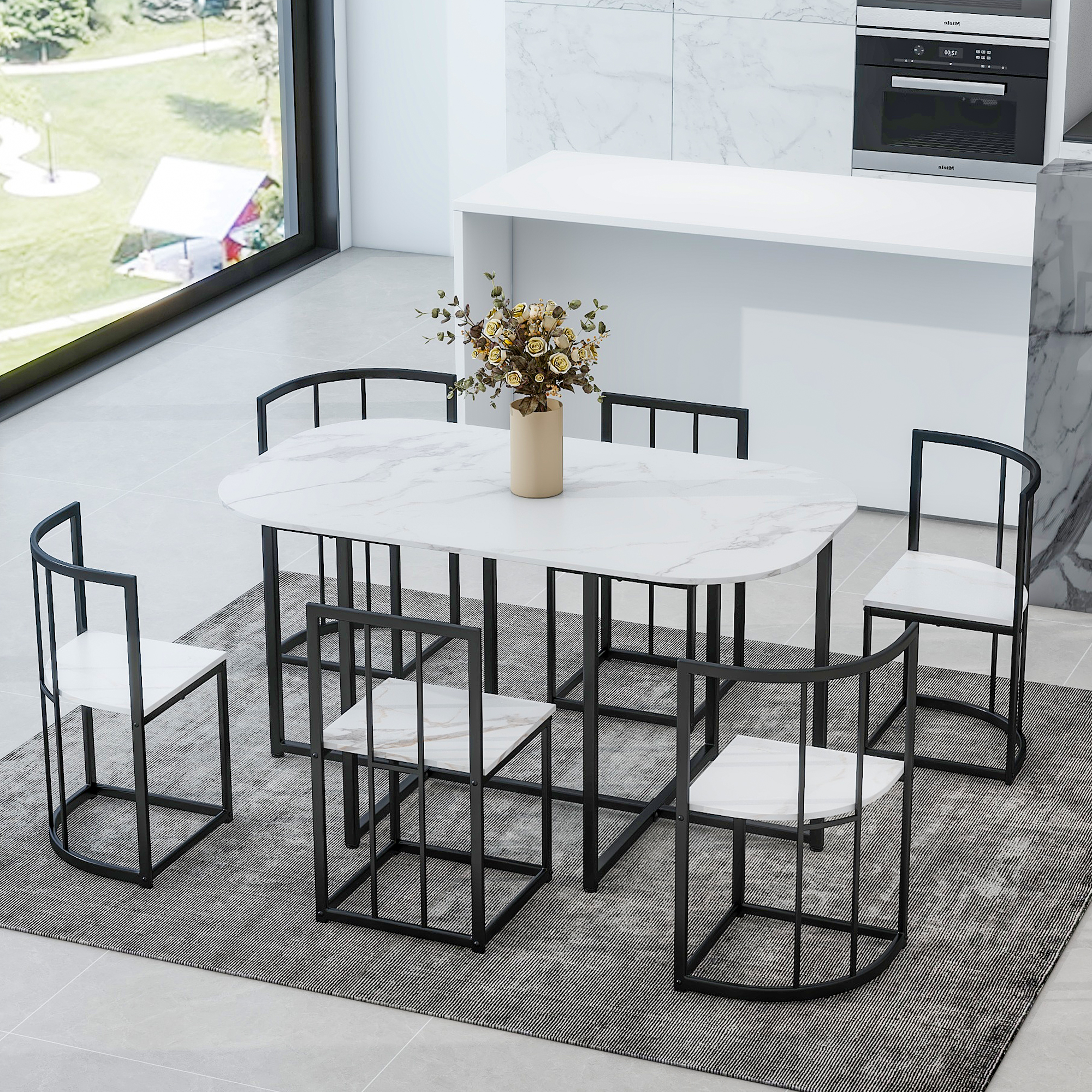 TOPMAx Modern 7- Piece Dining Table Set With Faux Marble Compact 55Inch Kitchen Table Set For 6 Black White