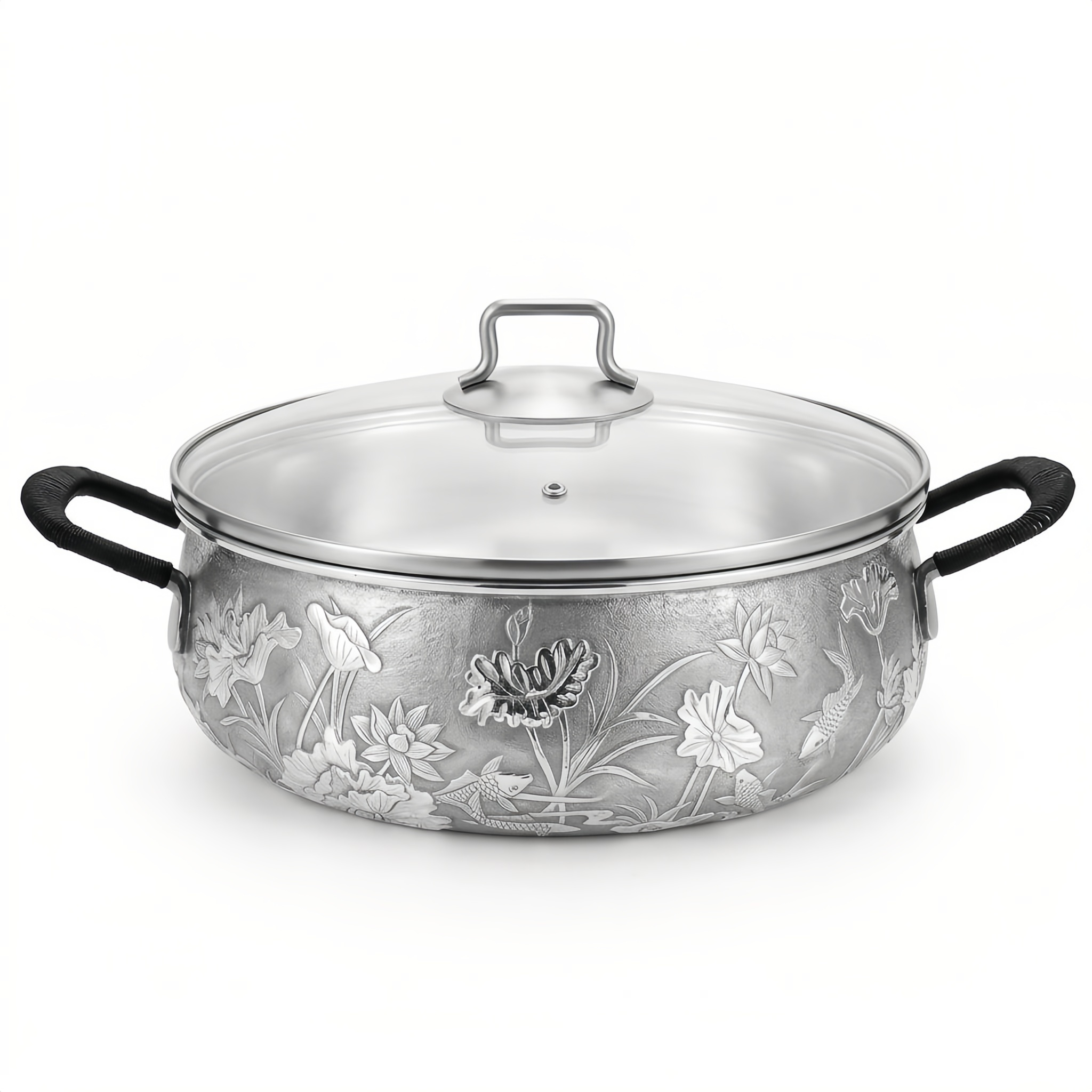 925 Sterling Silver Elegant Embossed Silver-Tone Cooking Pot with Intricate Lotus and Fish Patterns - Handicraft
