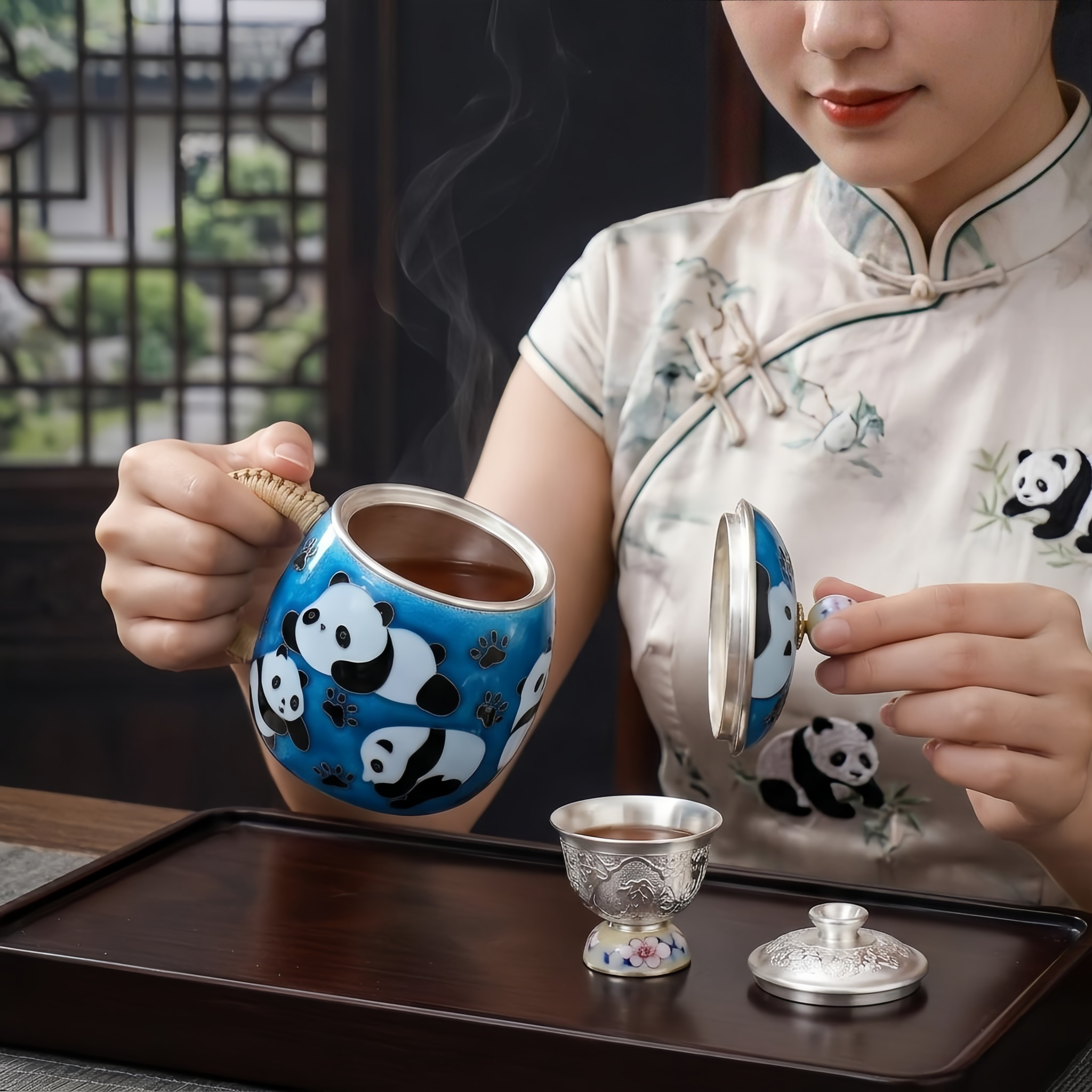 925 Sterling Silver Blue Panda Cloisonné Mug with Rattan Handle and Floral Knob Lid - Handicraft