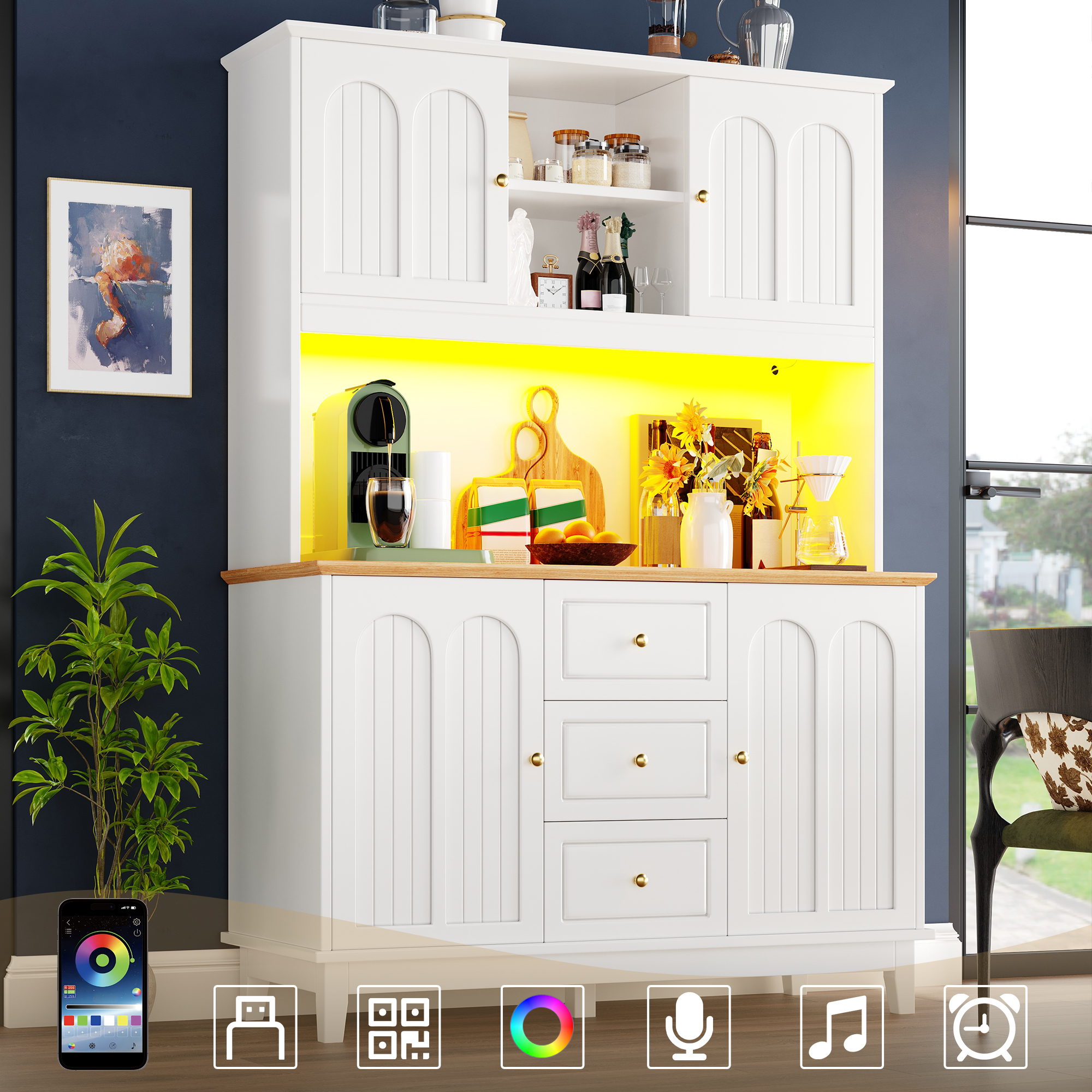 Pantry Cabinet With App Controlled LED Lights, 180cm Tall Kitchen Buffet Sideboard With 3 Drawers & Adjustable Shelves, Freestanding Storage Hutch For Dining Room & Kitchen