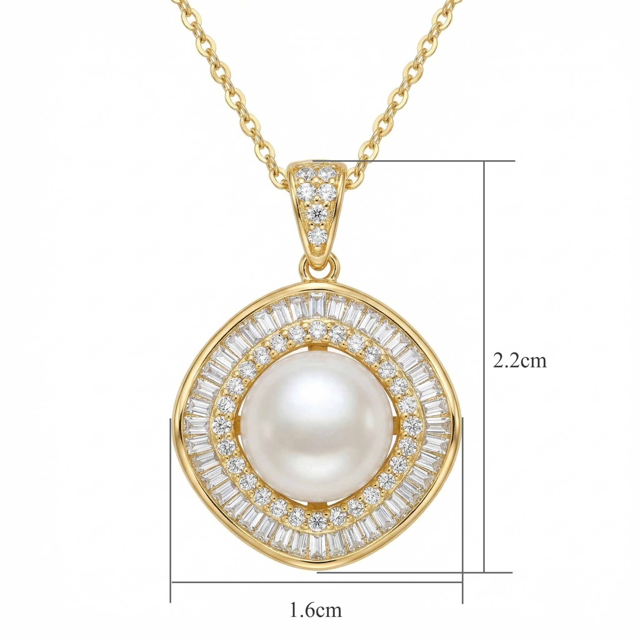 925 Sterling Silver Elegant Round Pearl Pendant Necklace with Sparkling CZ Double Halo and Baguette Accents