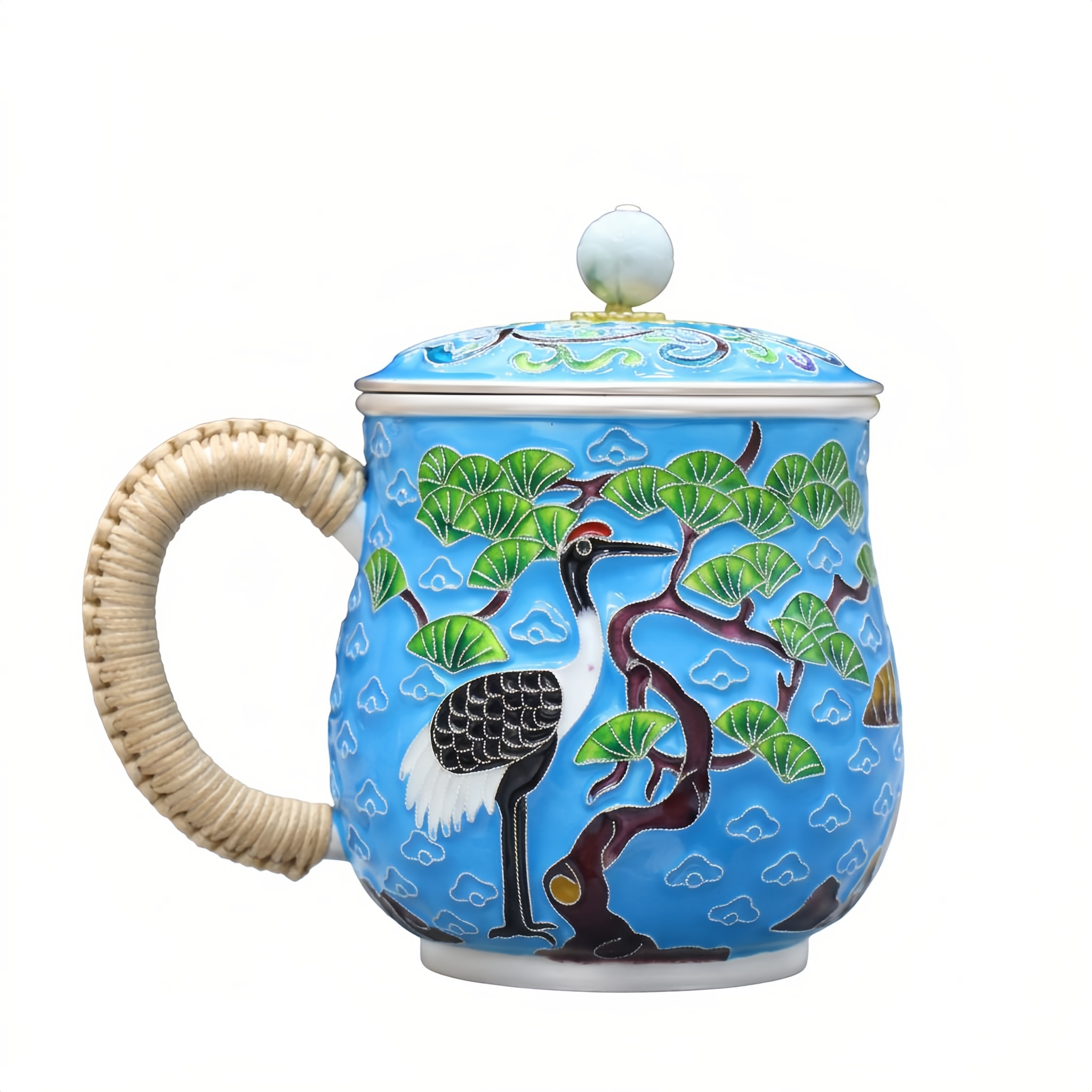 925 Sterling Silver Hand-Painted Blue Cloisonné Crane and Pine Tree Tea Mug with Rattan Handle - Handicraft