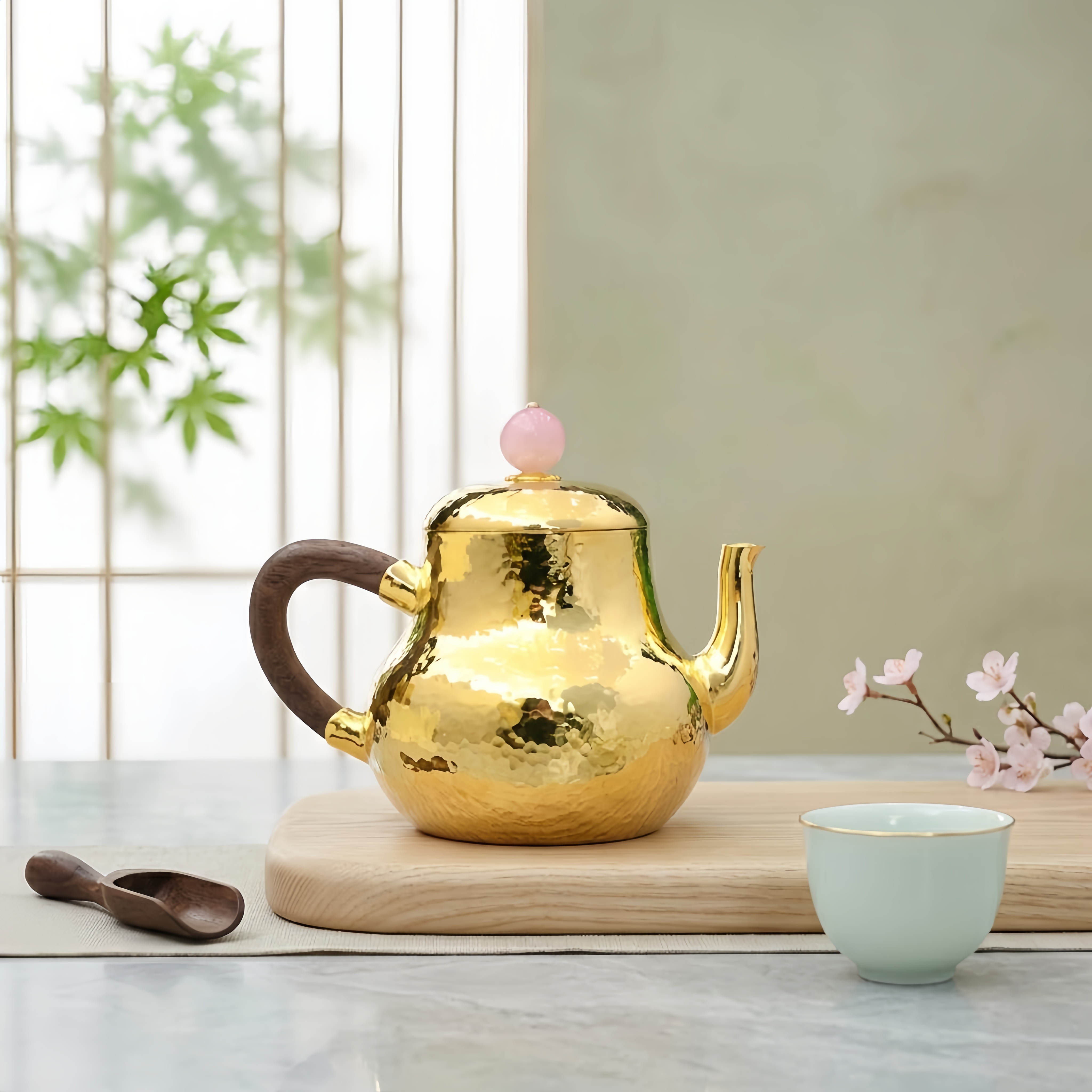 925 Sterling Silver Handcrafted Hammered Gilded Teapot with Natural Wood Handle and Rose Quartz Finial - Handicraft