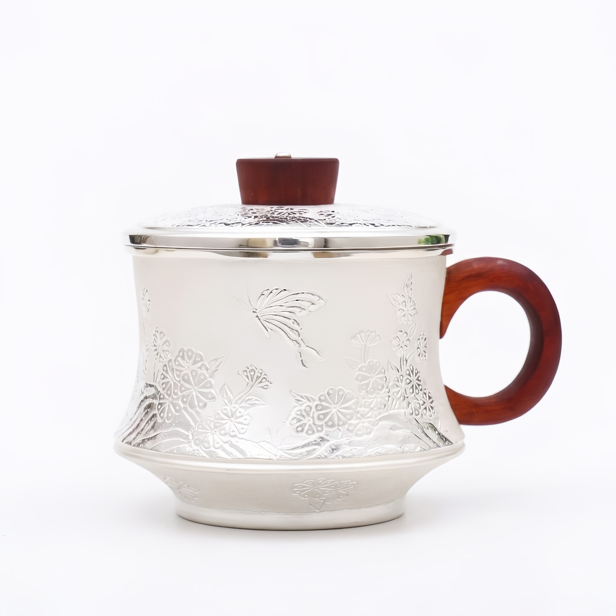 925 Sterling Silver Elegant Silver Teacup with Butterfly Relief, Wooden Handle, and Matching Lid - Handicraft
