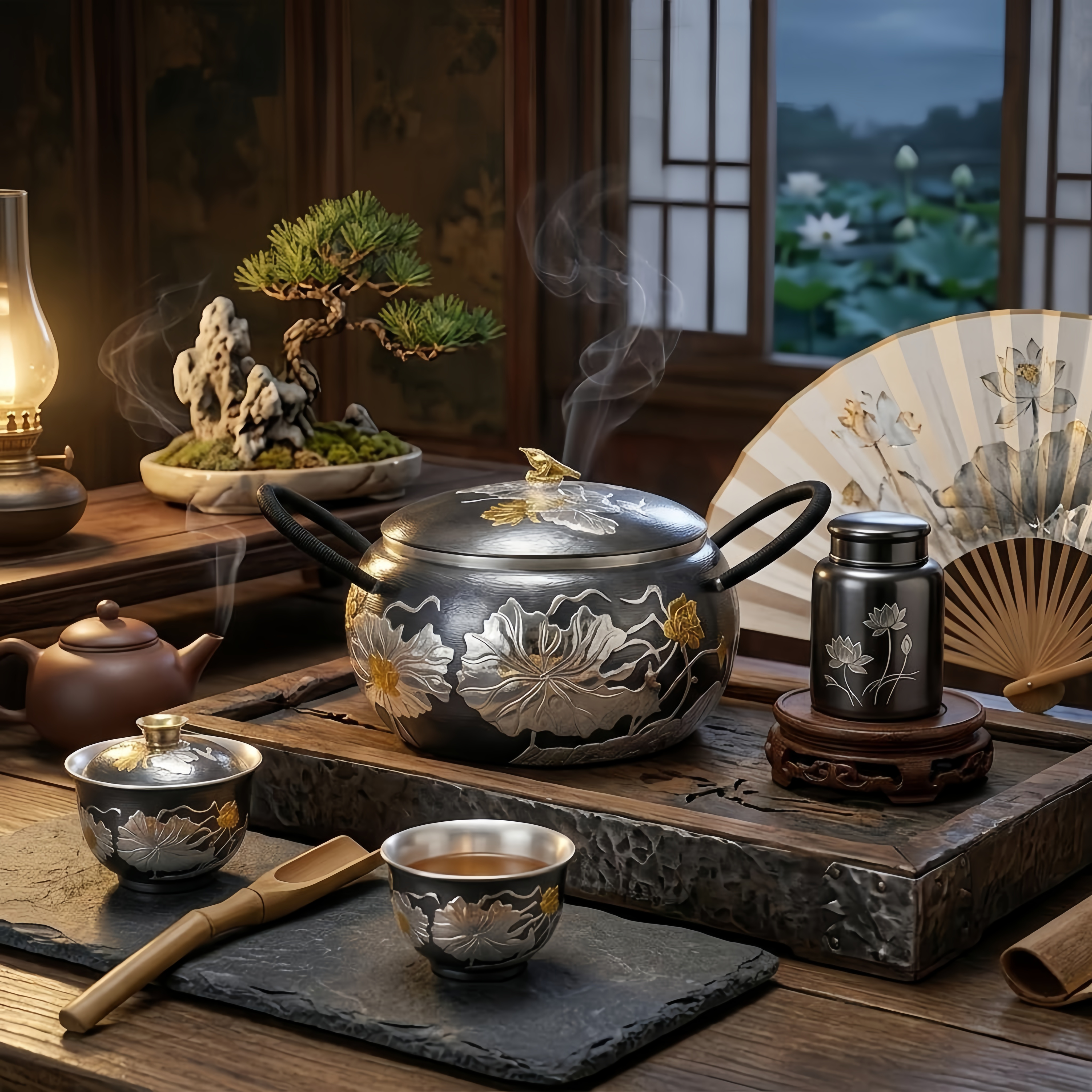 925 Sterling Silver Elegant Handcrafted Silver Lotus Motif Pot with Bird Ornament and Textured Finish - Handicraft