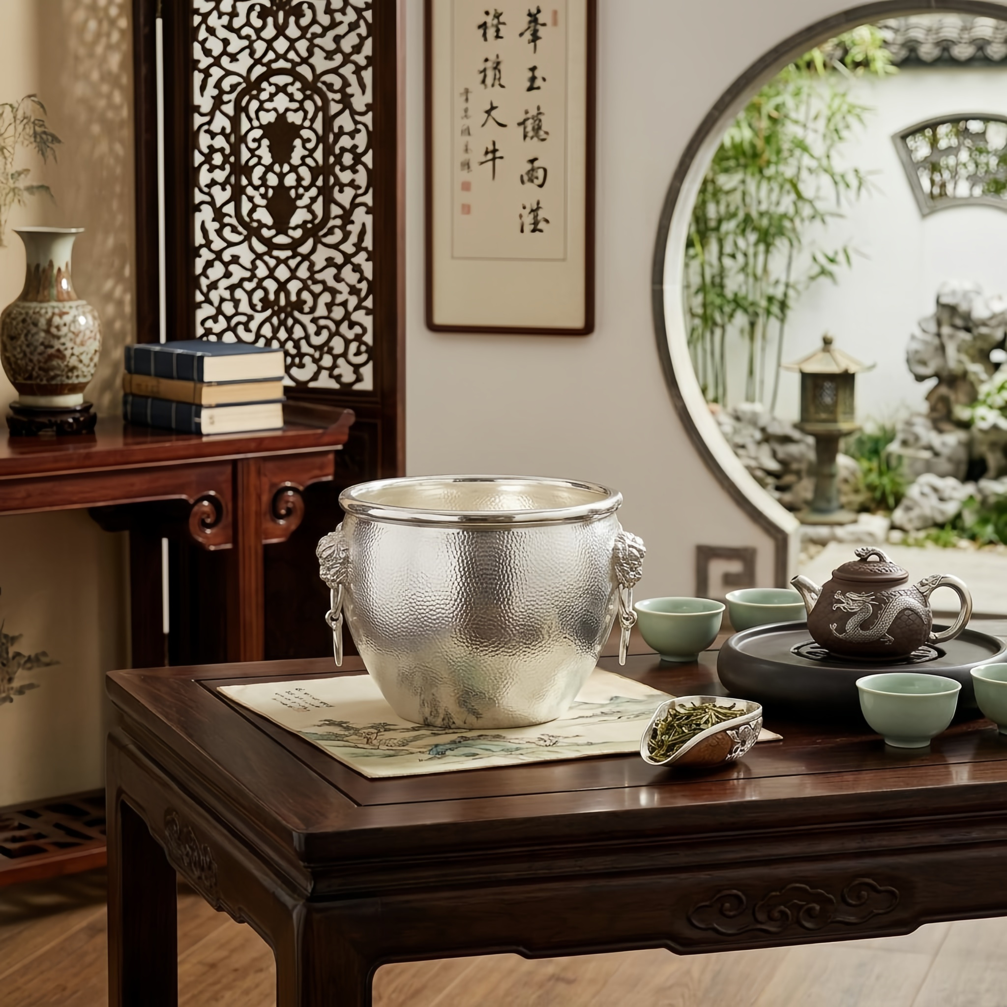 925 Sterling Silver Luxury Silver Hammered Wine Bucket with Ornate Lion Head Ring Handles - Handicraft
