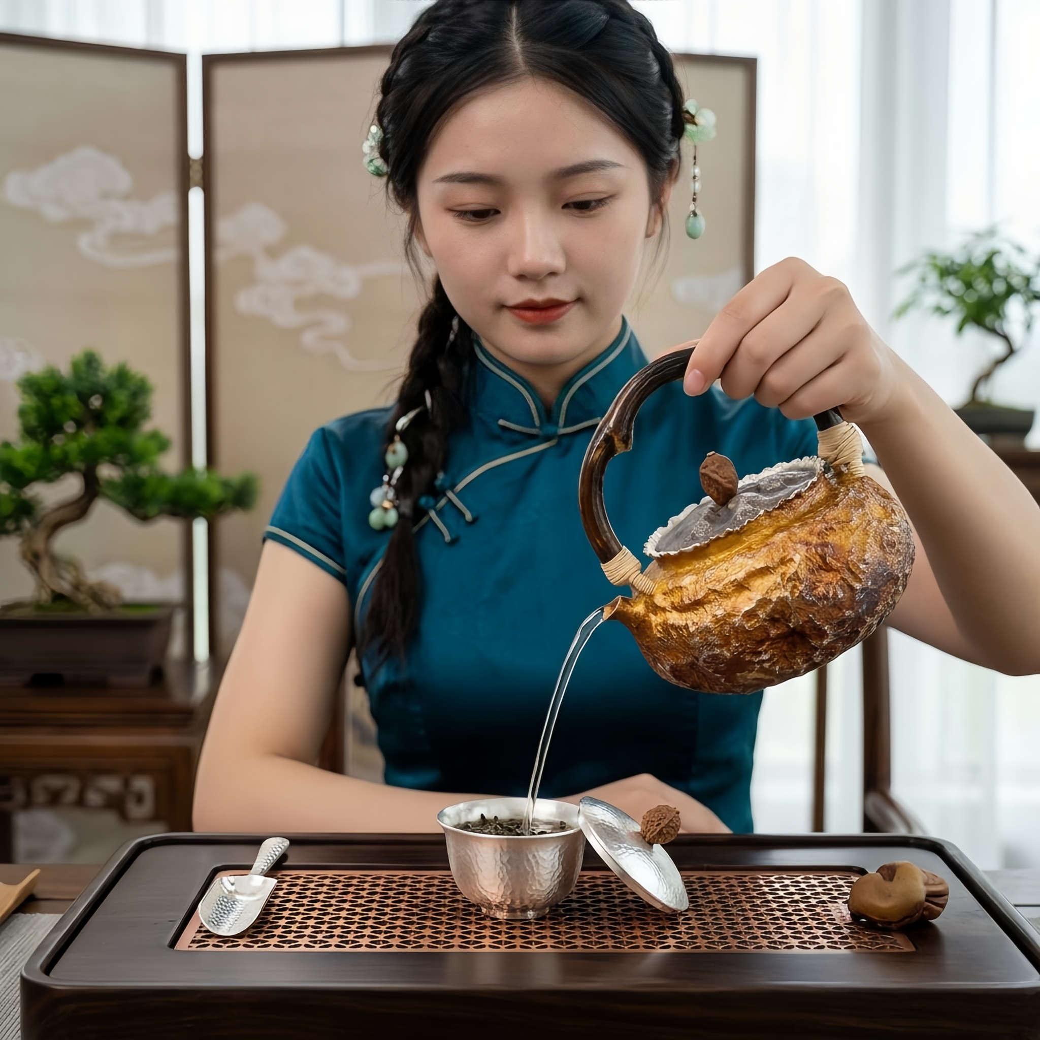 925 Sterling Silver Rustic Artisanal Ceramic Teapot with Hand-Woven Branch Handle and Earthy Textured Finish - Handicraft