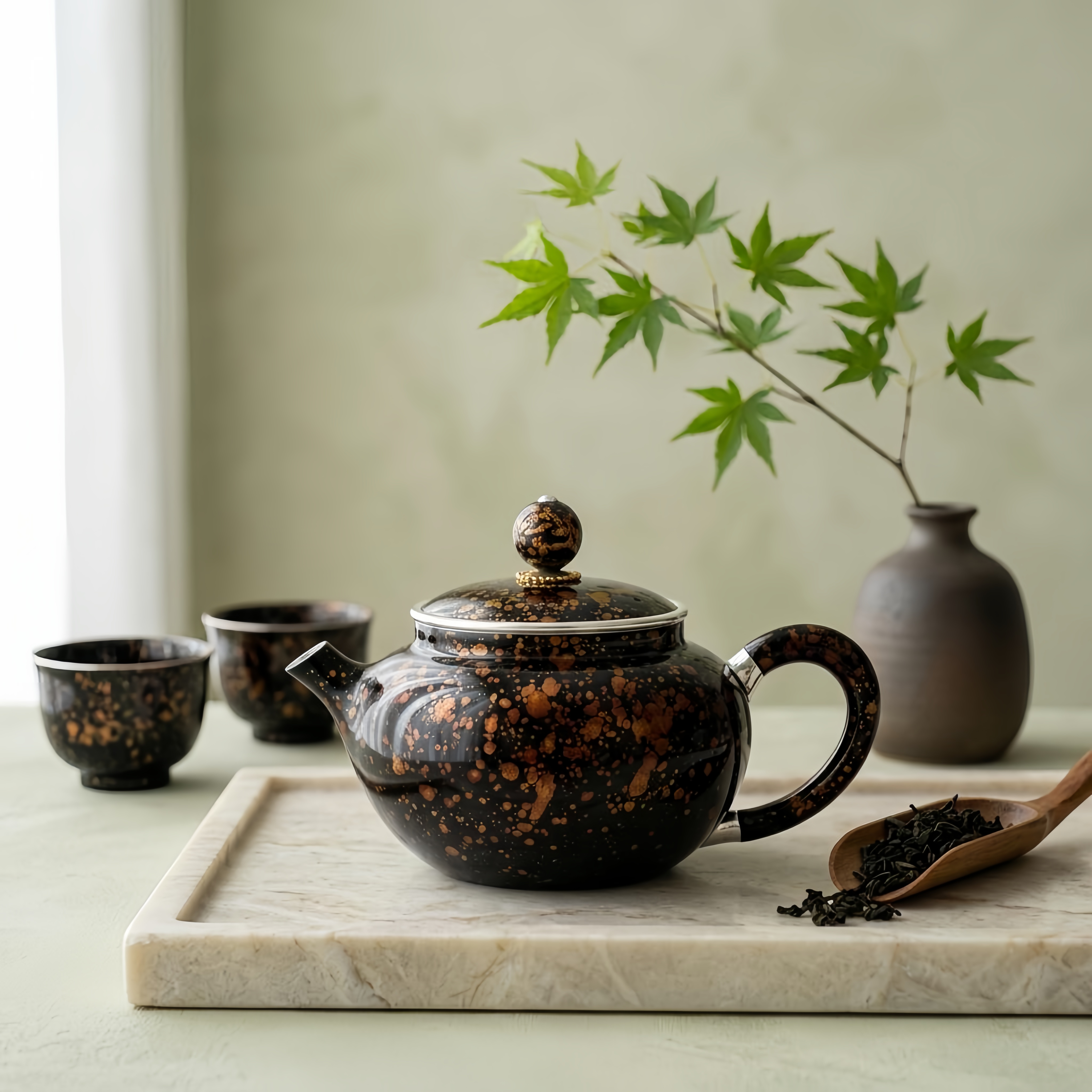 925 Sterling Silver Elegant Speckled Black Ceramic Teapot with Polished Silver Accents and Ornate Lid - Handicraft