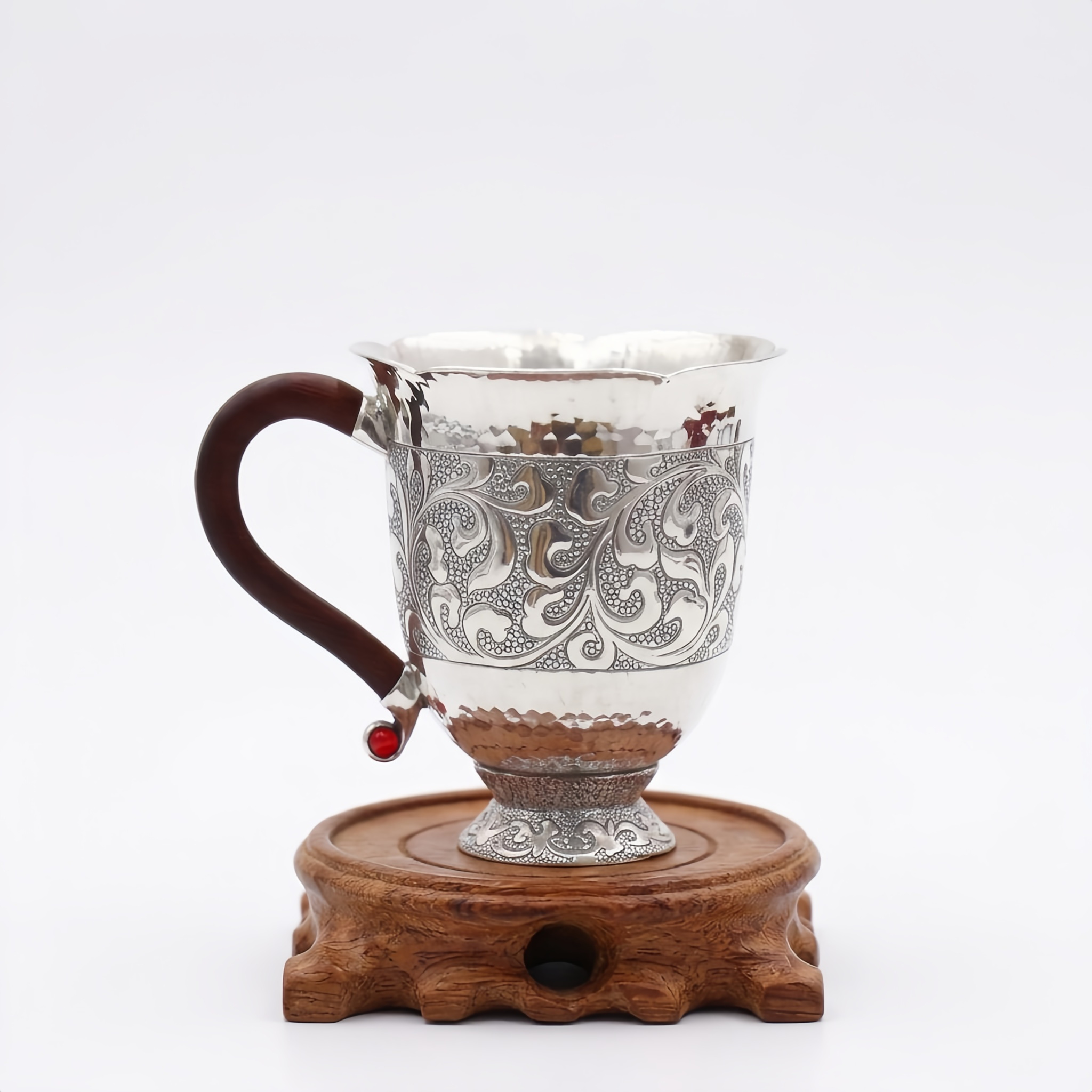 925 Sterling Silver Ornate Hand-Engraved Sterling Silver Pitcher with Dark Wood Handle and Intricate Floral Patterns - Handicraft