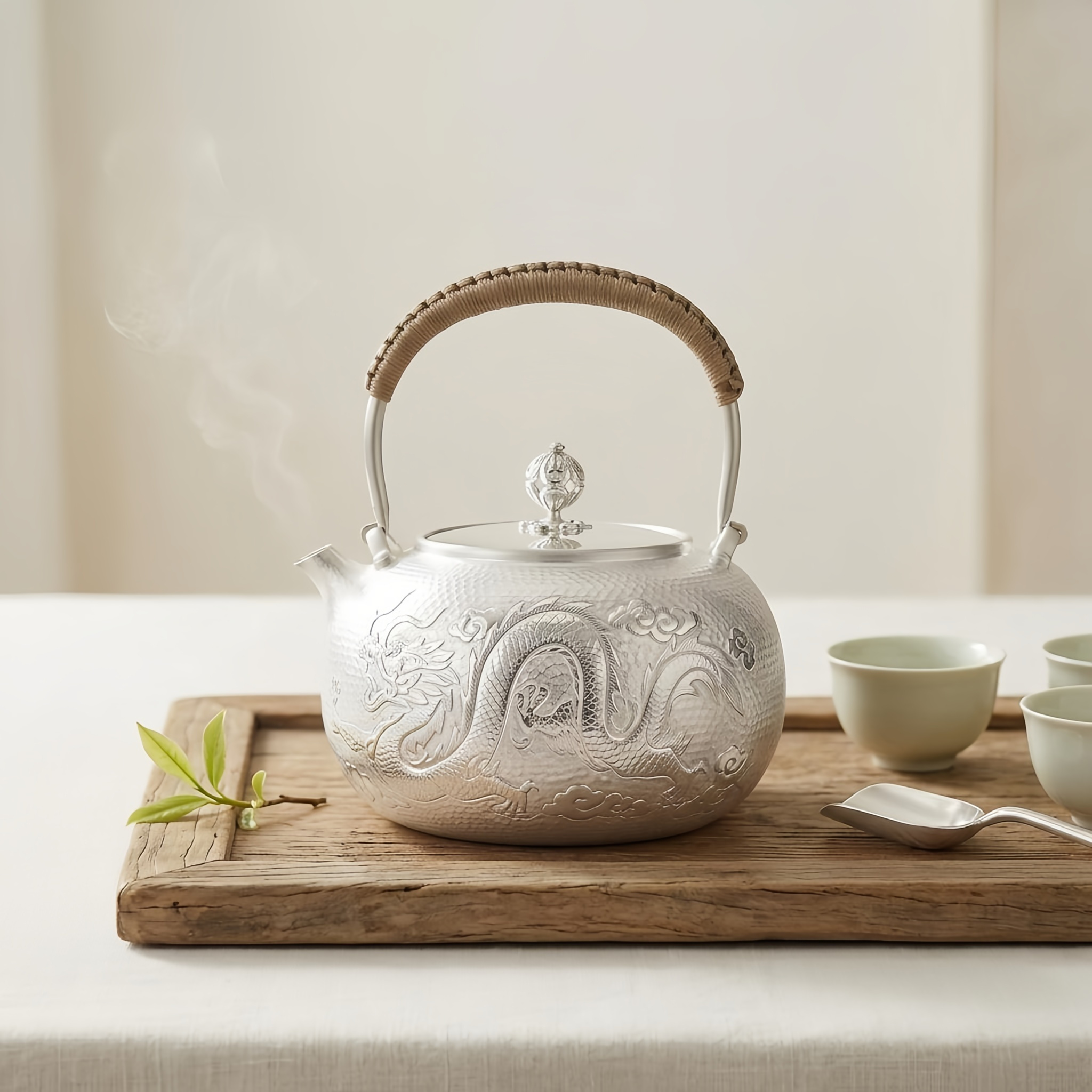 925 Sterling Silver Exquisite Silver Dragon Teapot with Intricate Hammered Texture and Woven Handle - Handicraft