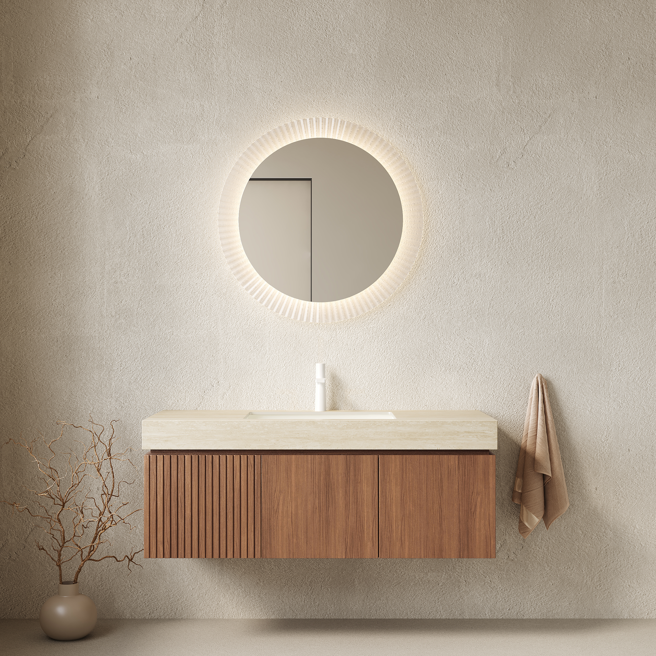 MURI 48 Bathroom Vanity&Sink, Floating Plywood Storage Cabinet With Drawer&Doors, Roma Travertine Sintered Stone Top&Ceramic Basin With 1 Pre-drilled Faucet Hole, Pre-assembled, Brown Oak Woodgrain