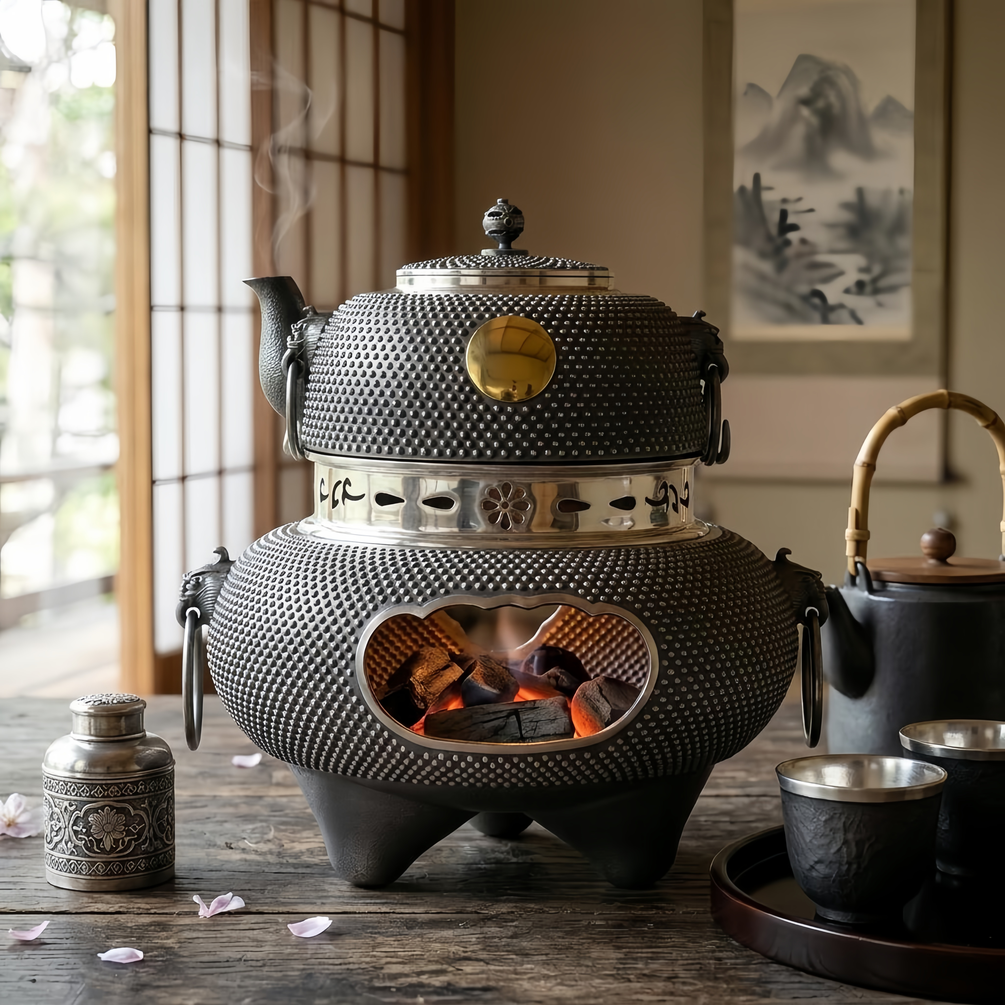 925 Sterling Silver Handcrafted Arare Textured Cast Iron Brazier with Polished Silver Accents and Shimmering Inlay - Handicraft