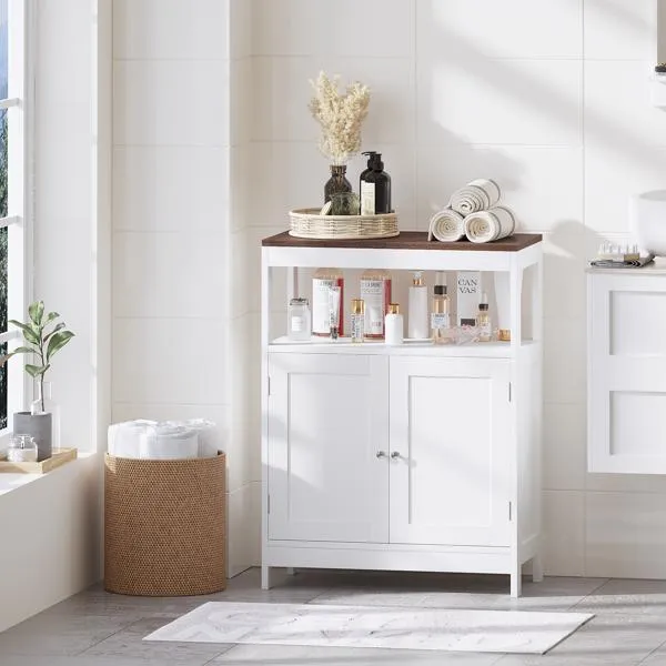 Modern Storage Cabinet With Double Doors, Free-Standing Bathroom Cabinet With Adjustable Shelf And Natural Wood Top, Multi-Purpose Organizer For Kitchen, Living Room, Bathroom Or Entryway - White