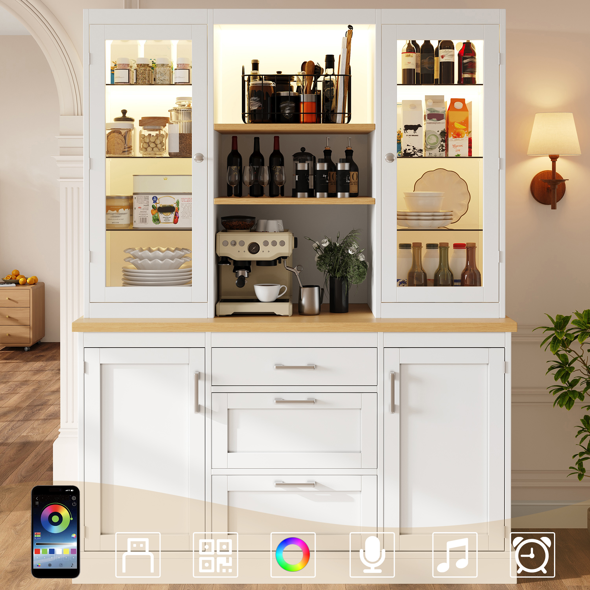 Kitchen Pantry Cabinet With App-Controlled LED Lights, 185cm Tall Storage Cabinet With Glass Doors, Drawers & Worktop, White