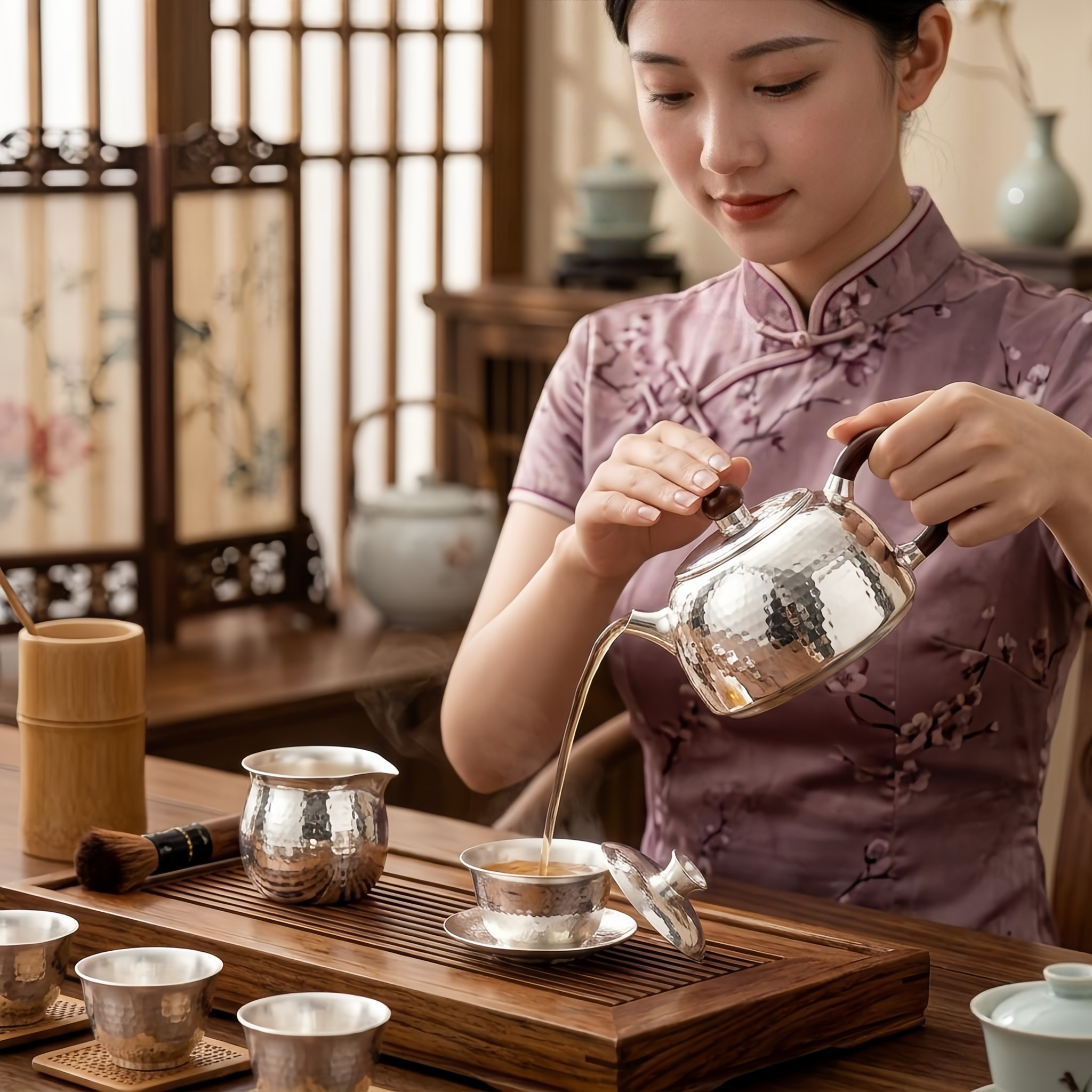925 Sterling Silver Elegant Hammered Silver-Tone Teapot with Polished Dark Wood Handle and Lid Knob - Handicraft