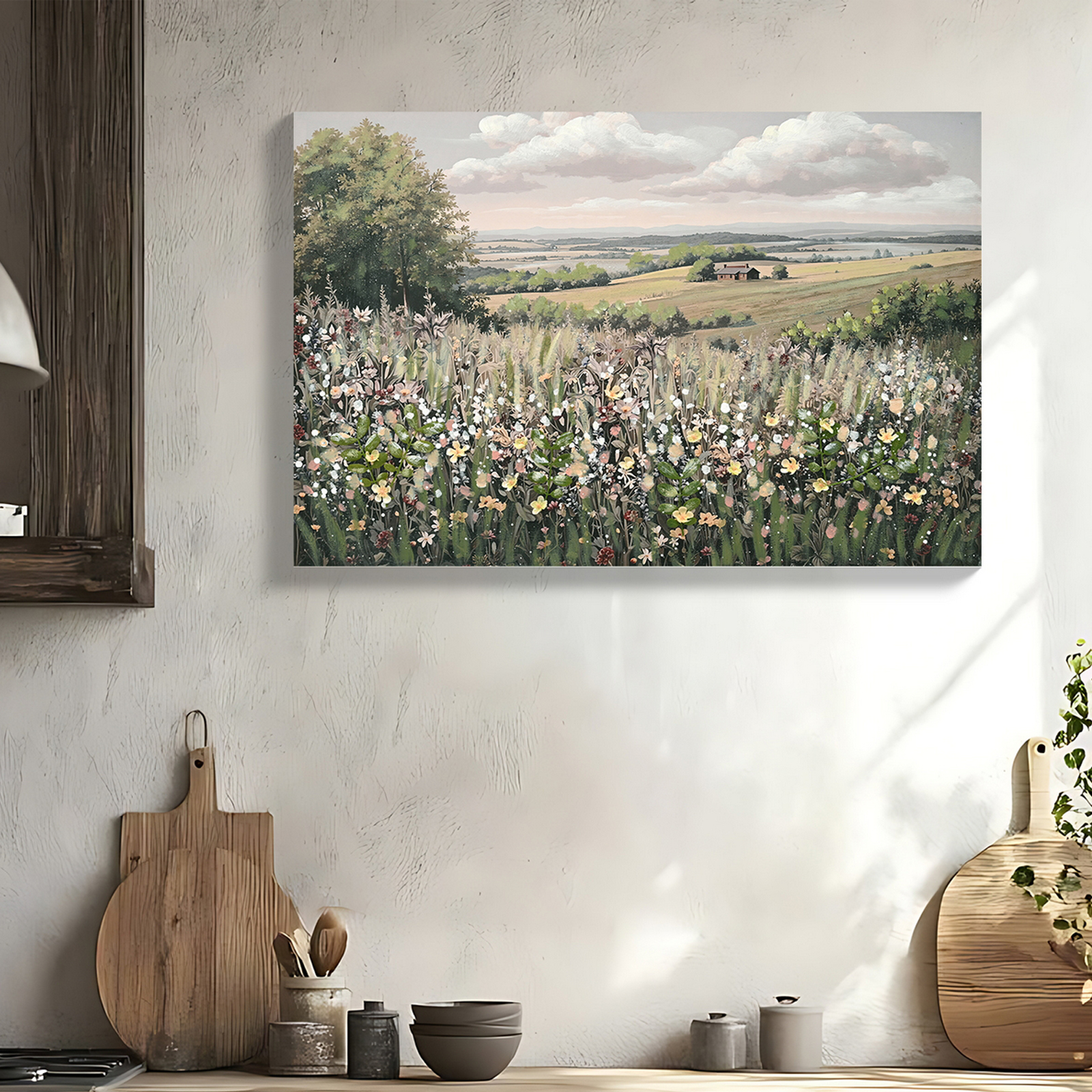 Framed Canvas Wall Art Vintage Decor, Landscape Wall Art, Meadow With Flowers Art, Modern Farmhouse Decor, Cottagecore Bedroom Bathroom Office Decorations, 24x36