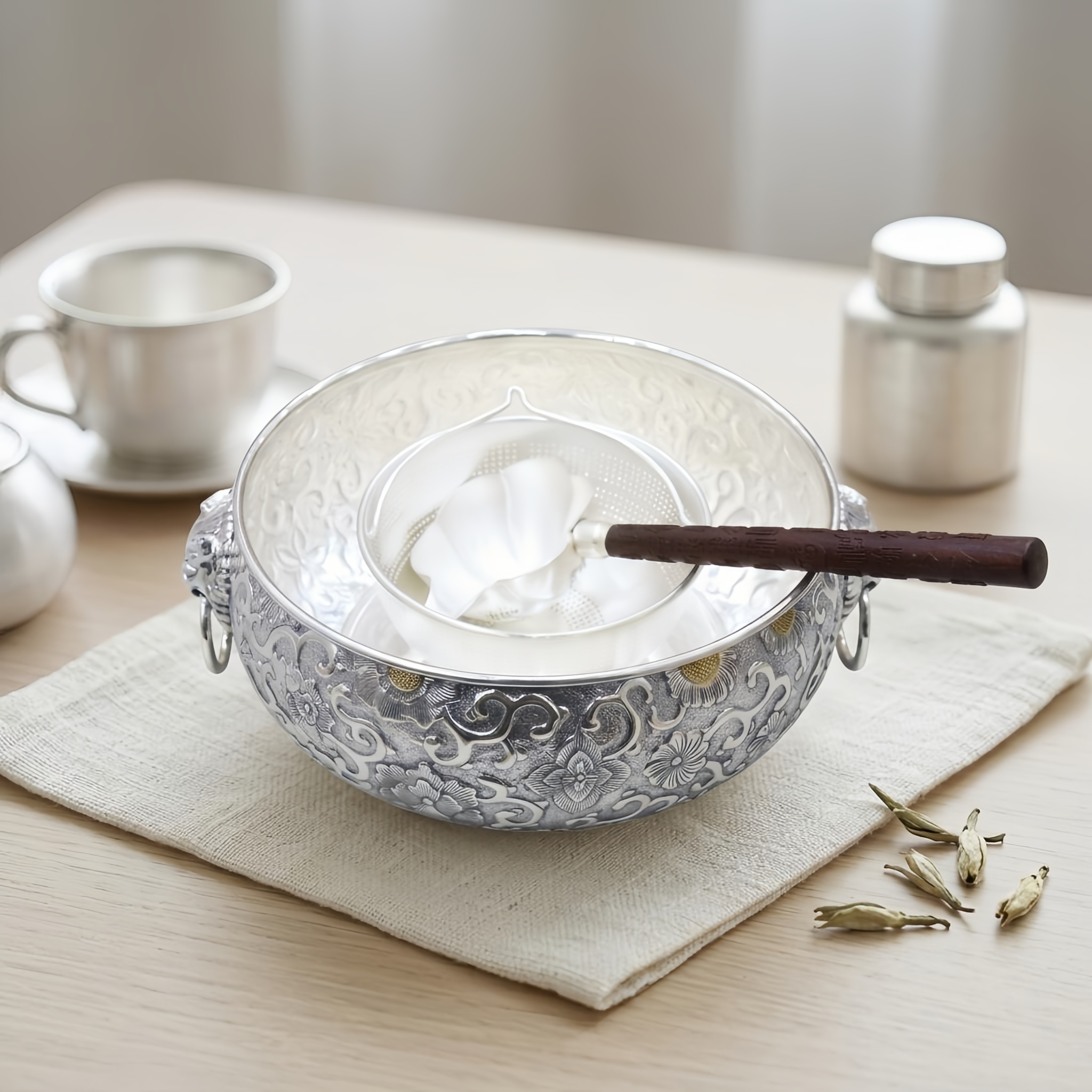 925 Sterling Silver Ornate Silver-Plated Embossed Floral Bowl Set with Lion Head Handles and Wooden Scoop - Handicraft