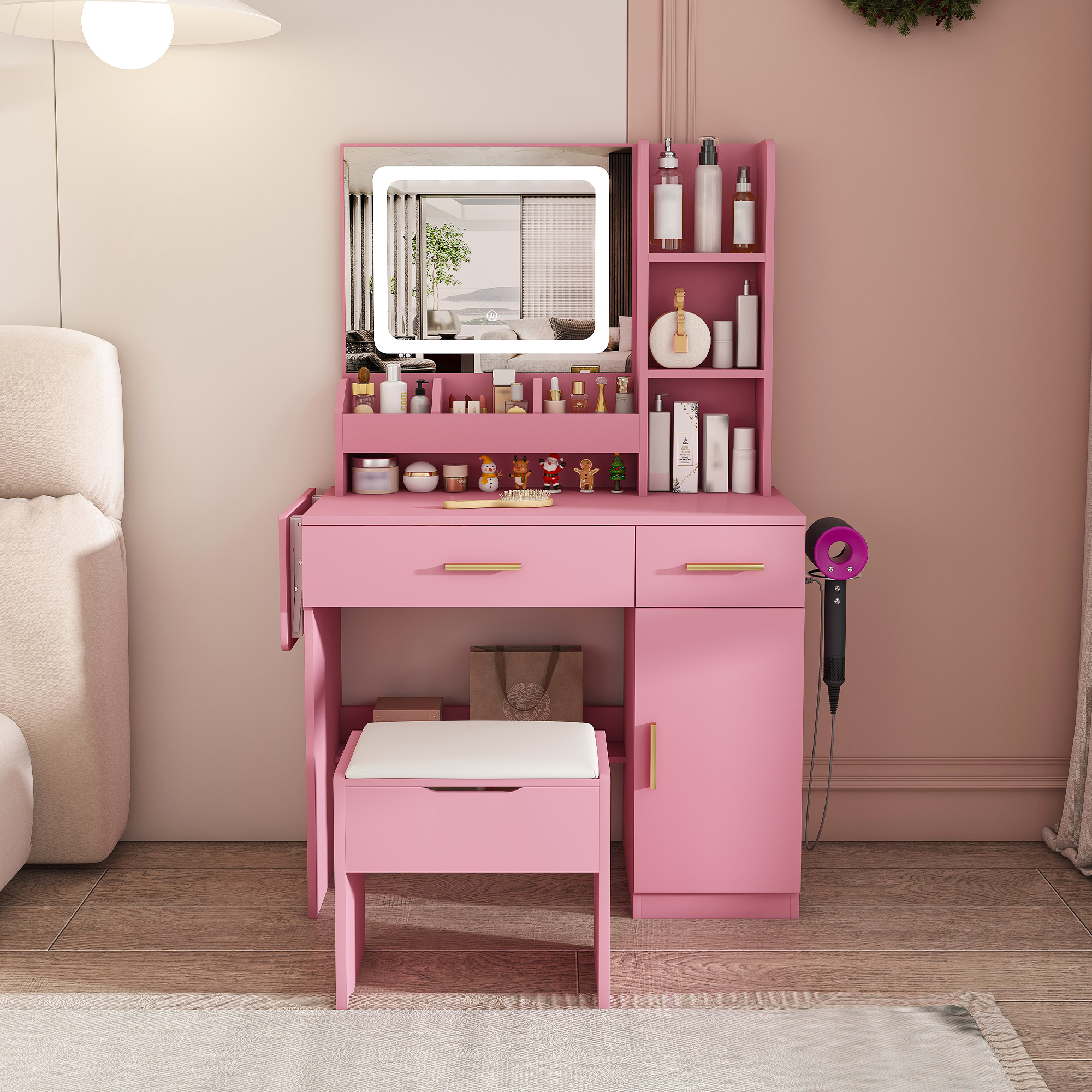 Vanity Desk With LED Mirror Lights And Power Outlet Charging Station Makeup Dressing Table With 3 Drawers 7 Shelves And Storage Stool For Girls And Women Pink