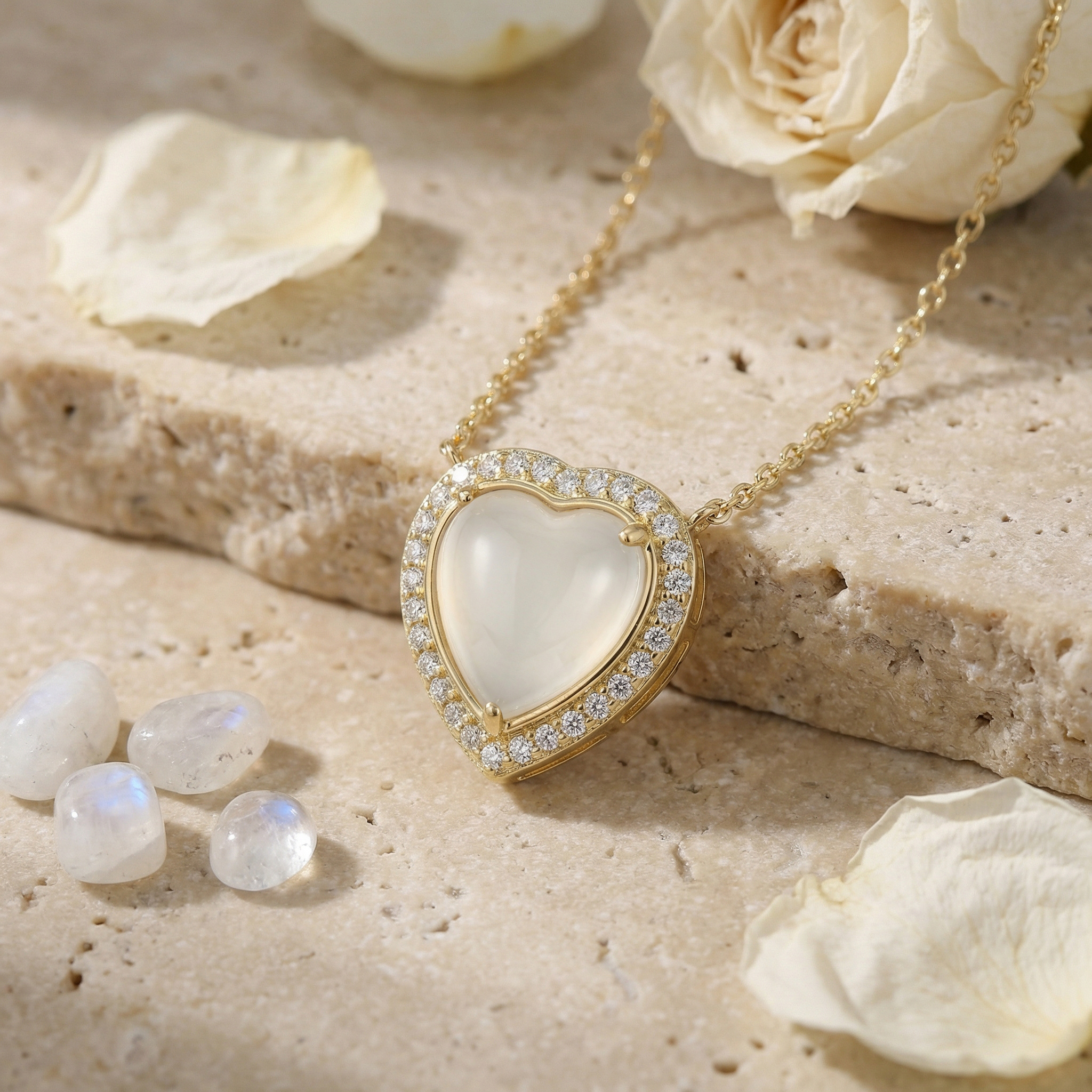 925 Sterling Silver Elegant Heart-Shaped Moonstone Pendant Necklace with Shimmering Halo
