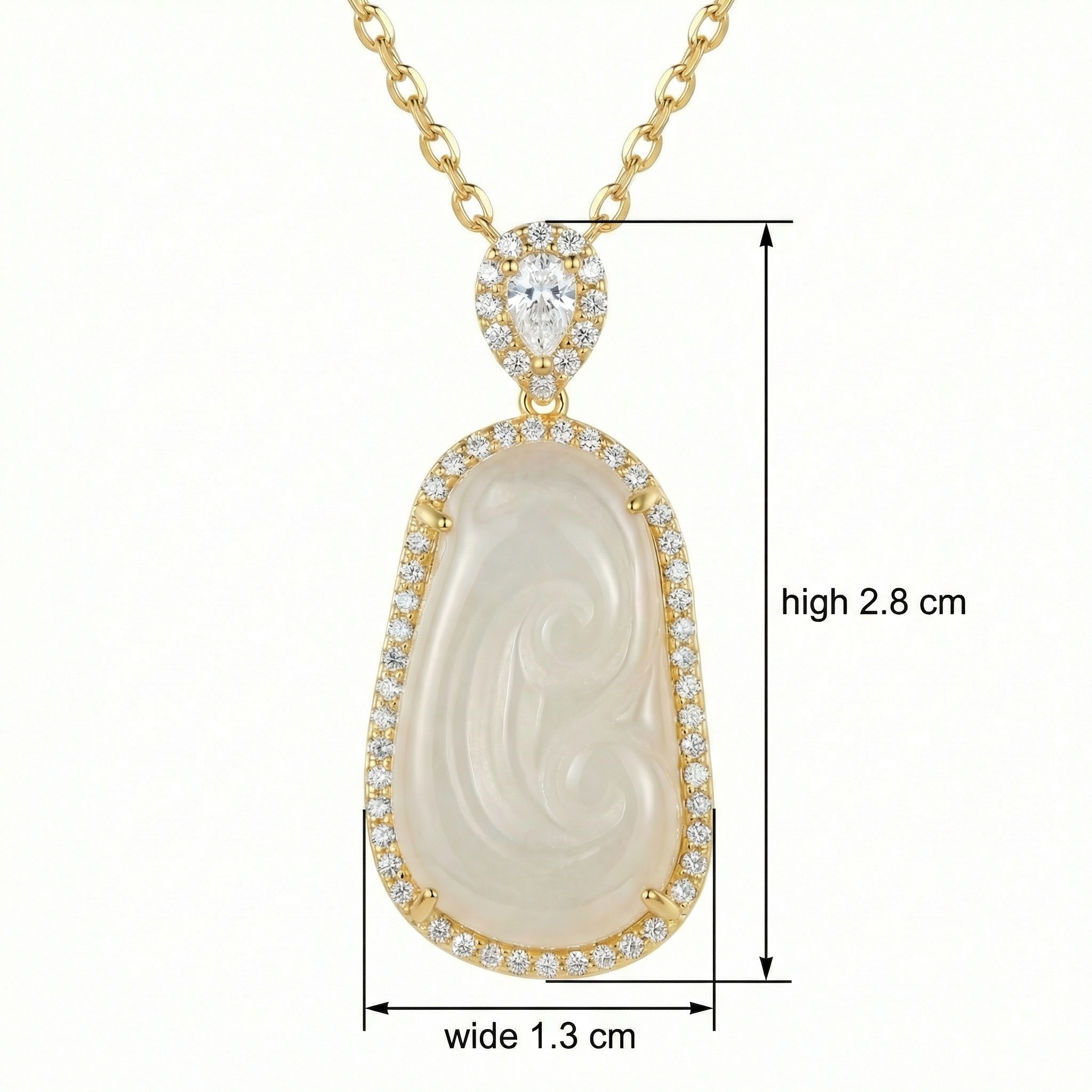 925 Sterling Silver Elegant Carved White Jade Pendant Necklace Featuring Shimmering Diamond Halo Accents