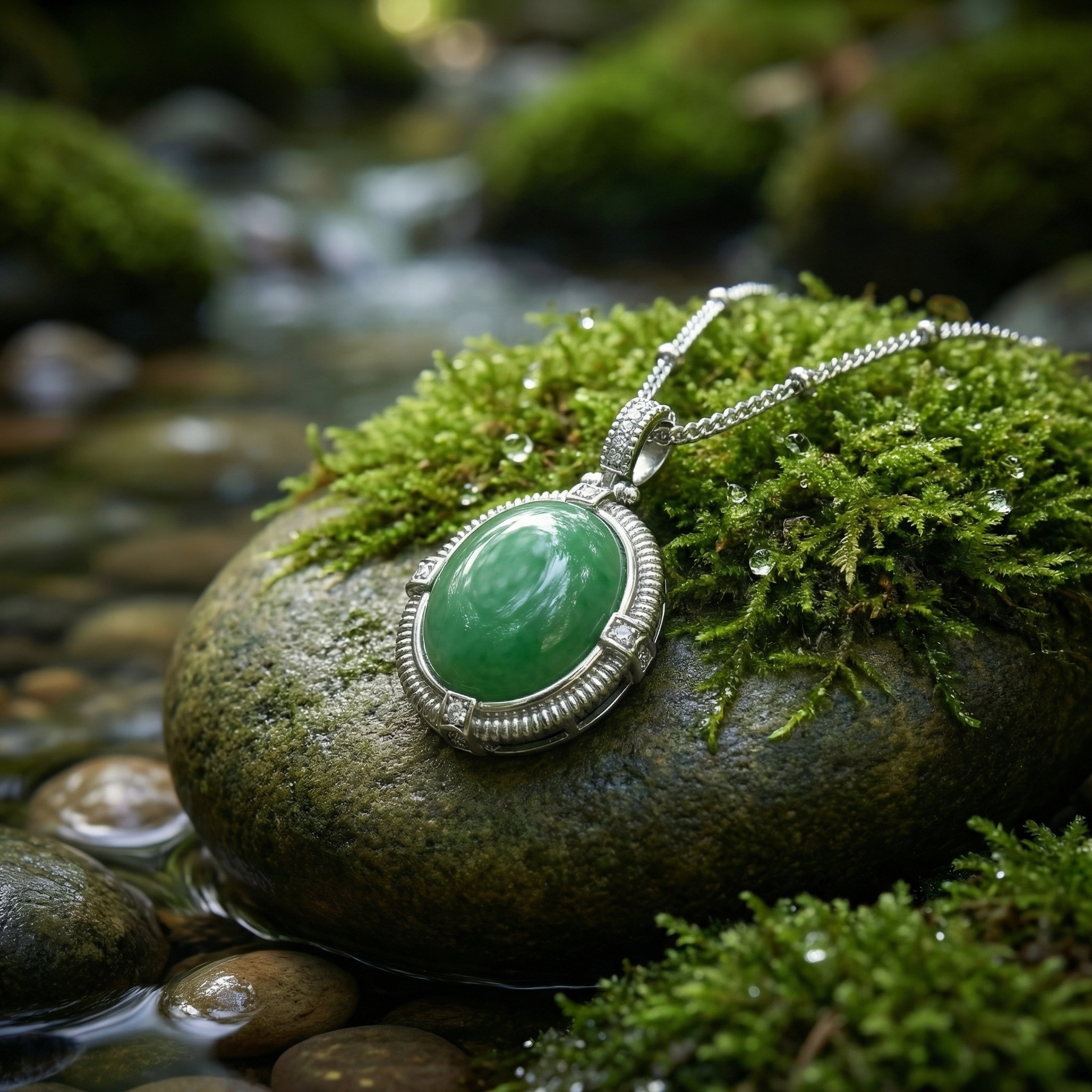925 Sterling Silver Elegant Silver Necklace featuring an Oval Green Jadeite Pendant with CZ Accents