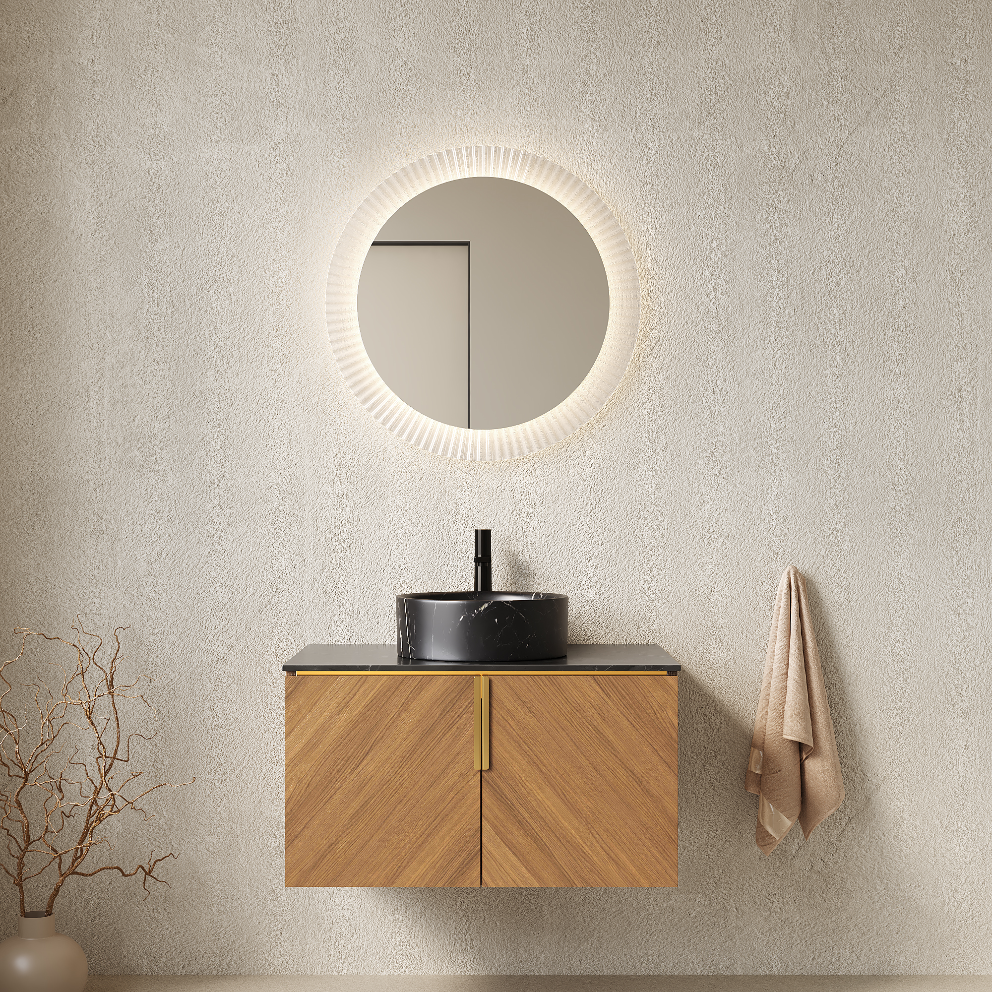ARAI 30 Bathroom Vanity&Sink, Wall-Mounted Plywood Bathroom Storage Cabinet With Double Doors, Black Sintered Stone Countertop&Black Round Ceramic Basin With Stone Pattern, Brown Oak Woodgrain Color