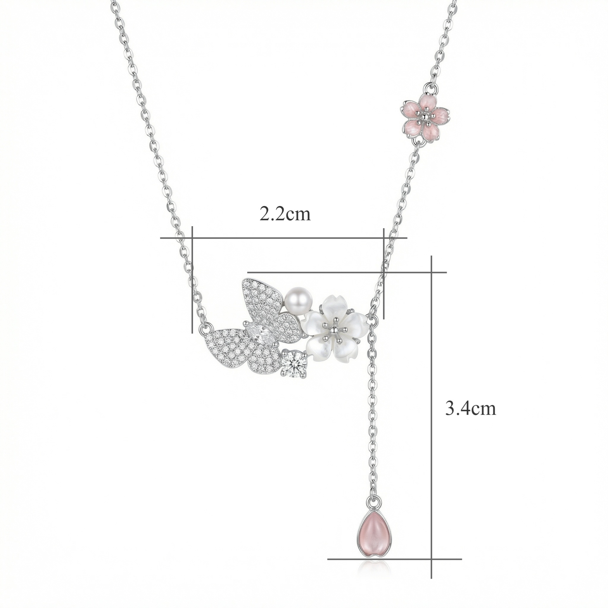 925 Sterling Silver Elegant Butterfly and Cherry Blossom Silver Necklace with Pink Pendant