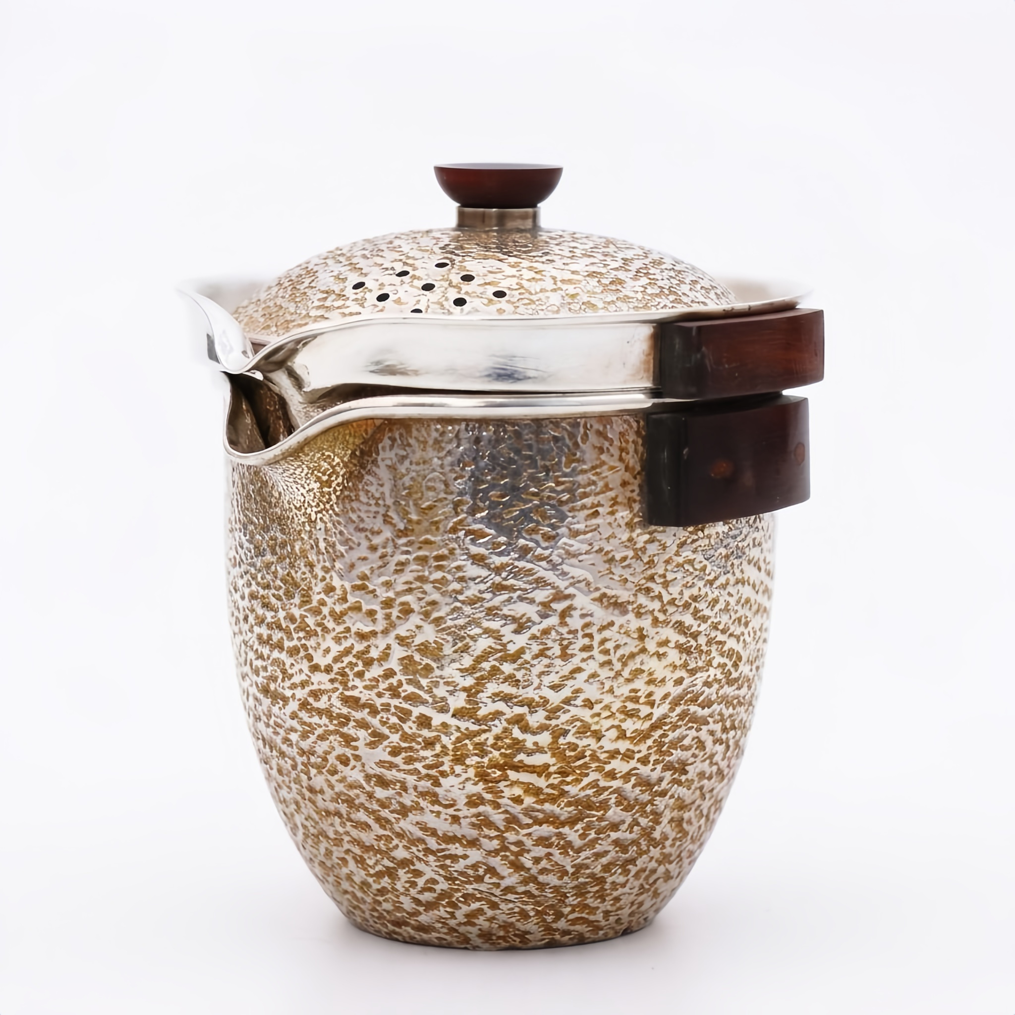 925 Sterling Silver Elegant Handcrafted Metallic Pot with Gold Speckles and Wooden Handles-Fine Tea Dispenser - Handicraft