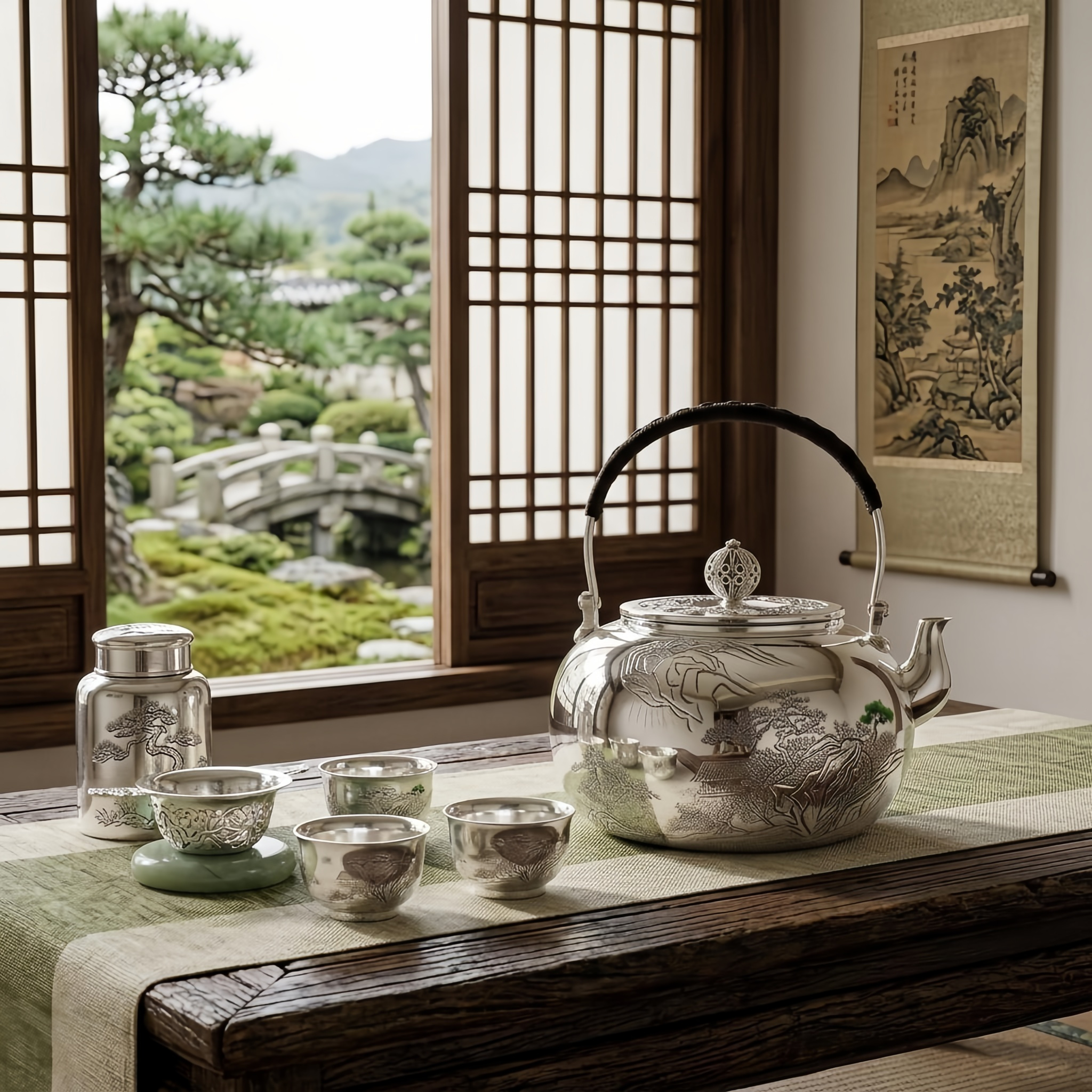 925 Sterling Silver Elegant Hand-Engraved Silver Teapot with Traditional Landscape Scene and Woven Handle - Handicraft