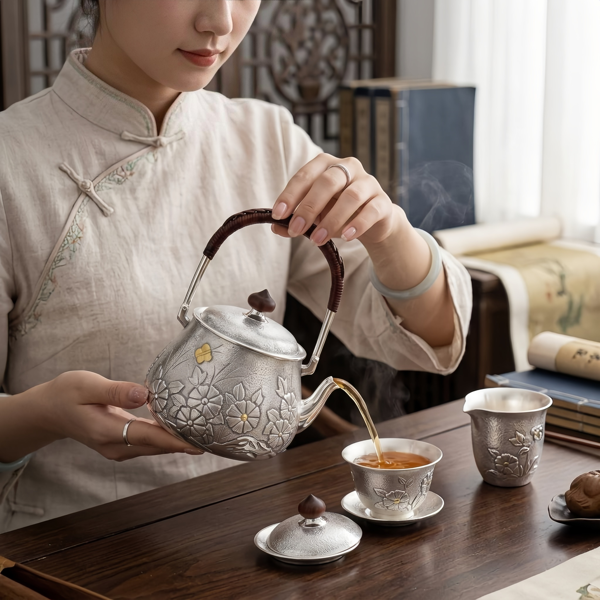 925 Sterling Silver Elegant Handcrafted Silver Teapot with Floral Motifs and Woven Rattan Handle - Handicraft