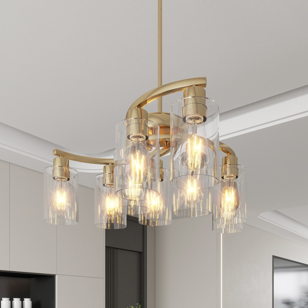 9-Light Gold Glass Chandelier, Adjustable Height Dining Room Light Fixtures Over Table, Contemporary Hanging Chandelier For Kitchen Island Living Room Foyer Office, Clear Glass Shade