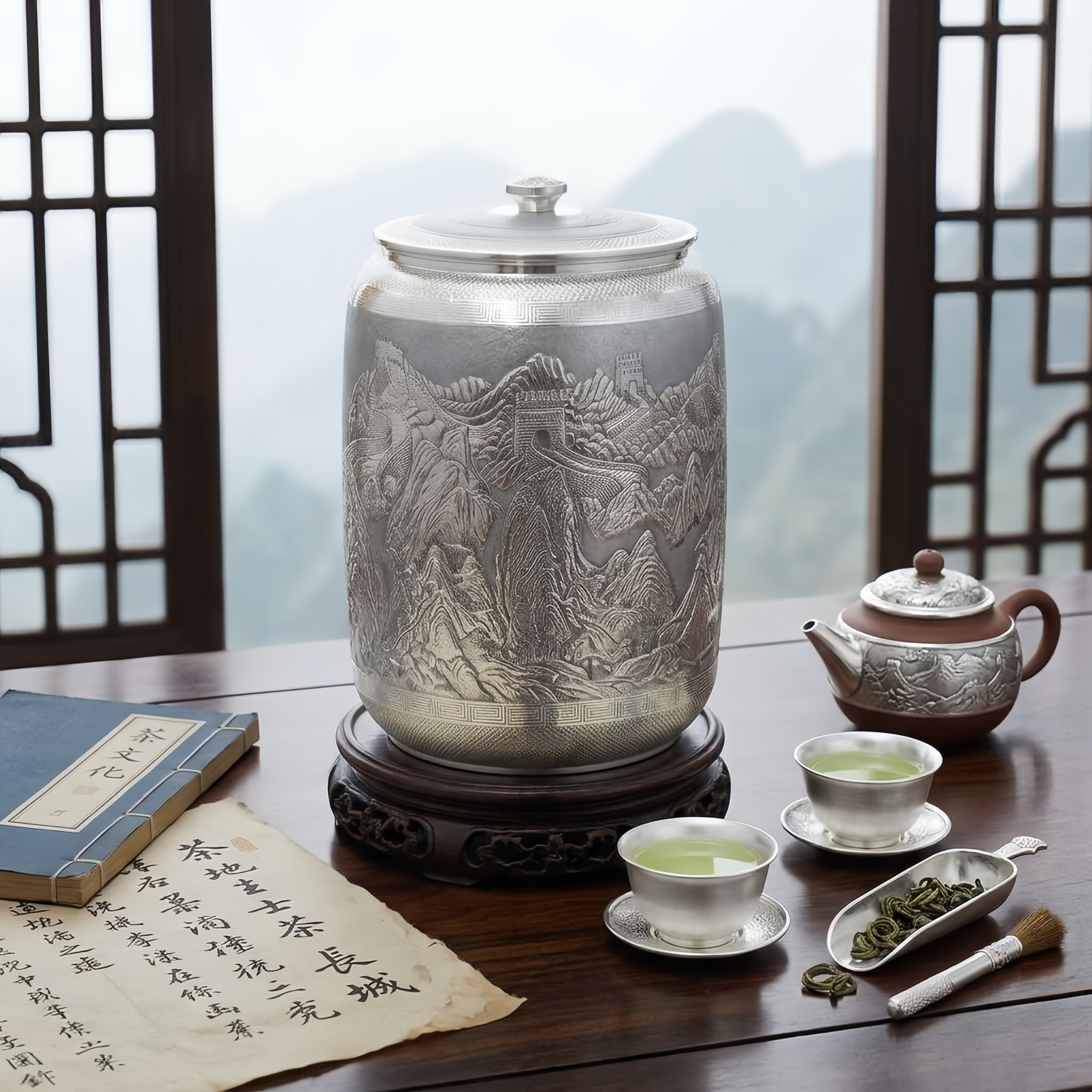 925 Sterling Silver Exquisite Silver Jar with Embossed Great Wall of China Mountain Landscape - Handicraft