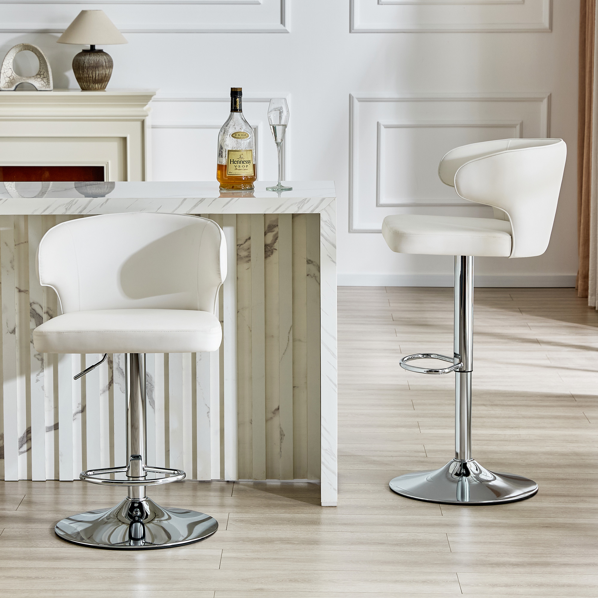 Modern Rotating Adjustable Bar Chair, PU Leather Belt Backrest Swivel Chair, Suitable For Kitchen Bar Counter And Dining Room, Adjustable Height, Capable Of Bearing 300 Pounds White -2 Pieces